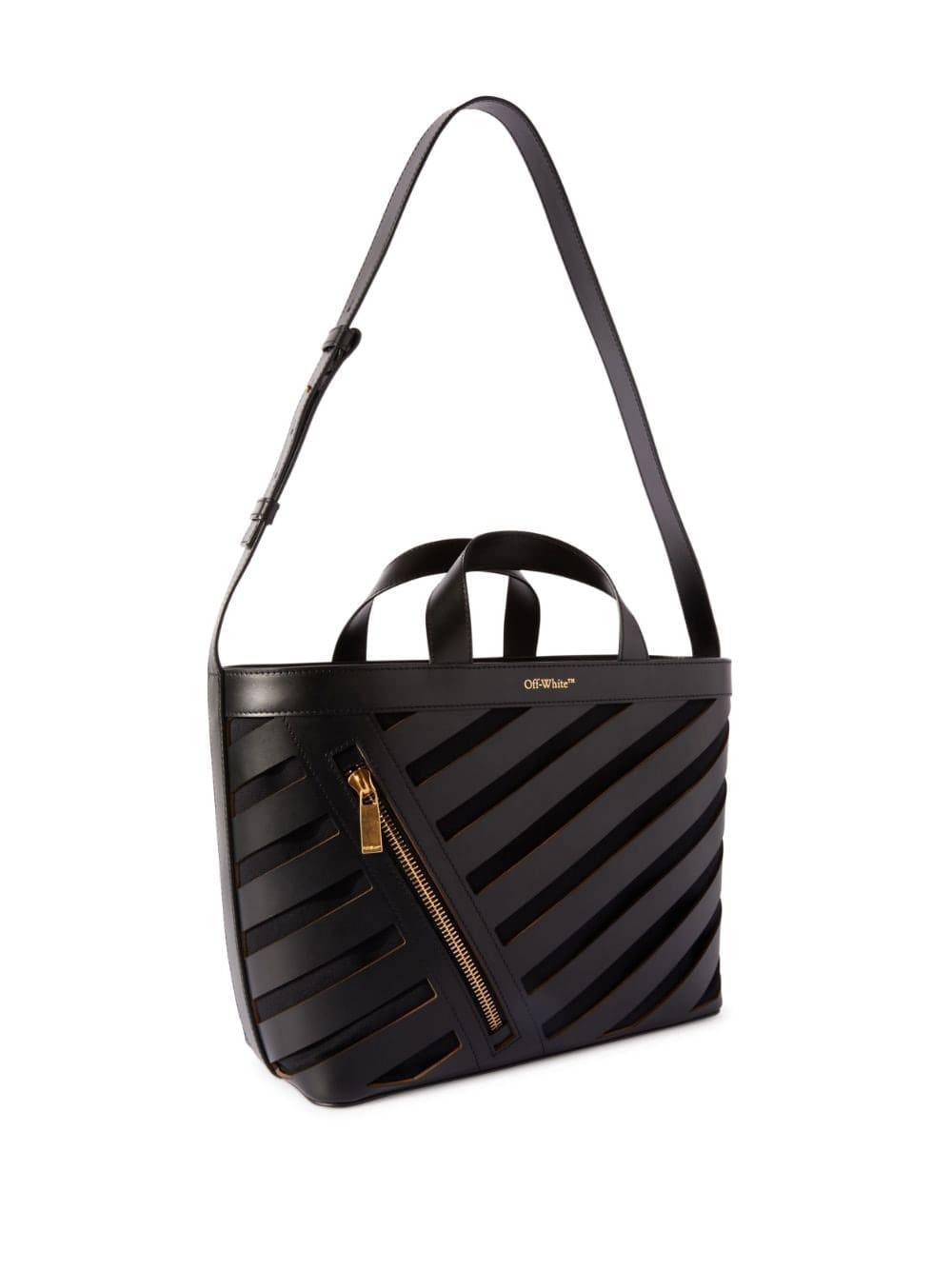 The Diag-print is one of Off-White's most celebrated motifs, appearing throughout the brand's collections. Here it adorns this leather tote bag, complemented by a gold-tone logo lettering for a distinctive finish.