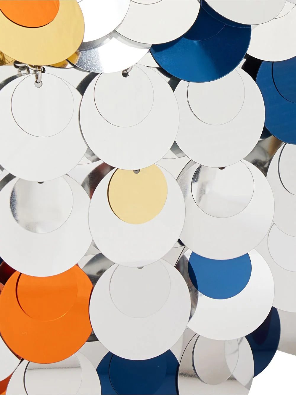 Paco Rabanne presents a miniature version of its iconic Sparkle bag, a signature design from the late '60s. It's crafted from overlapping silver, orange and blue mirror-effect discs joined by metal loops. The compact accessory is equipped with a sliding chain-link strap that allowa it to be hand-carried or worn over the shoulder.