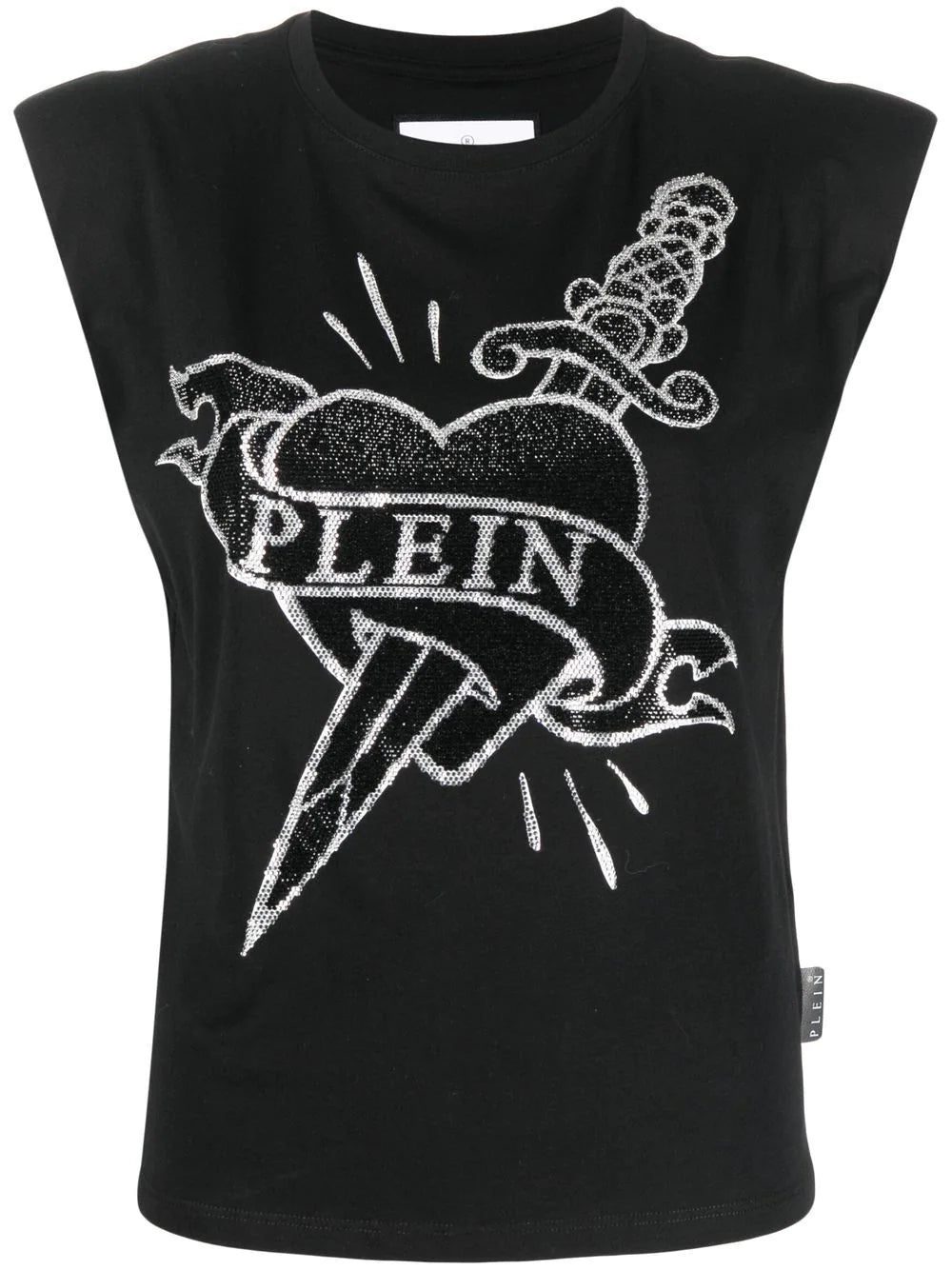 crystal-embellished logo tank top from PHILIPP PLEIN featuring black, logo patch to the rear, crystal embellishment, crew neck, sleeveless, shoulder pads and straight hem.