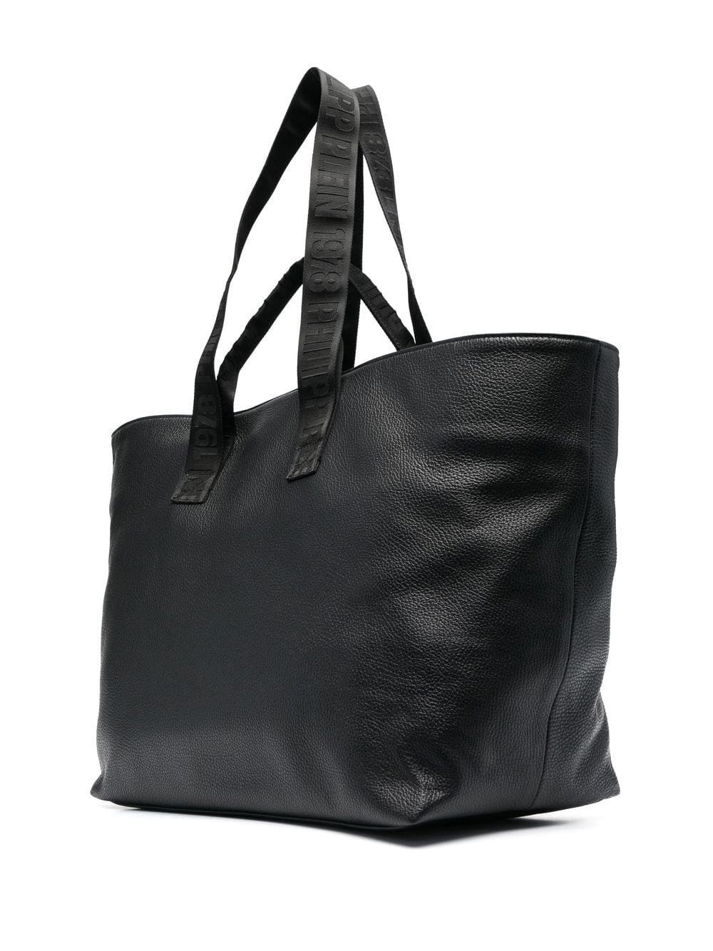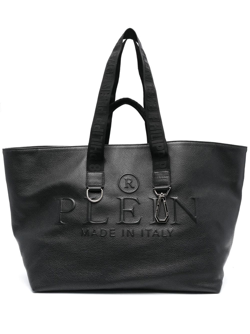 black calf leather embossed finish embossed logo to the front detachable shoulder strap two rolled top handles open top leopard print lining internal zip-fastening pocket