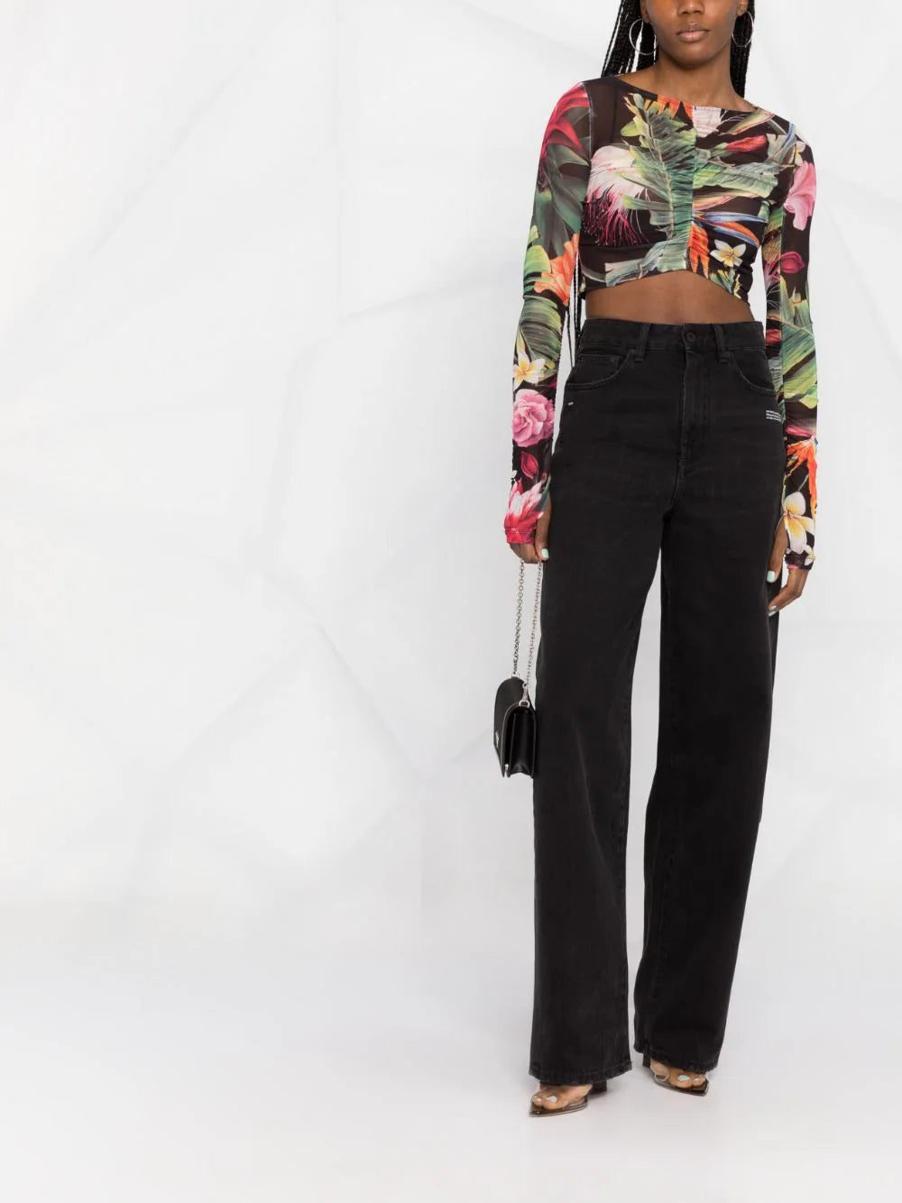 Multicoloured Flowers long-sleeve top from PHILIPP PLEIN featuring all-over floral print, crew neck, gathered detailing and cropped.