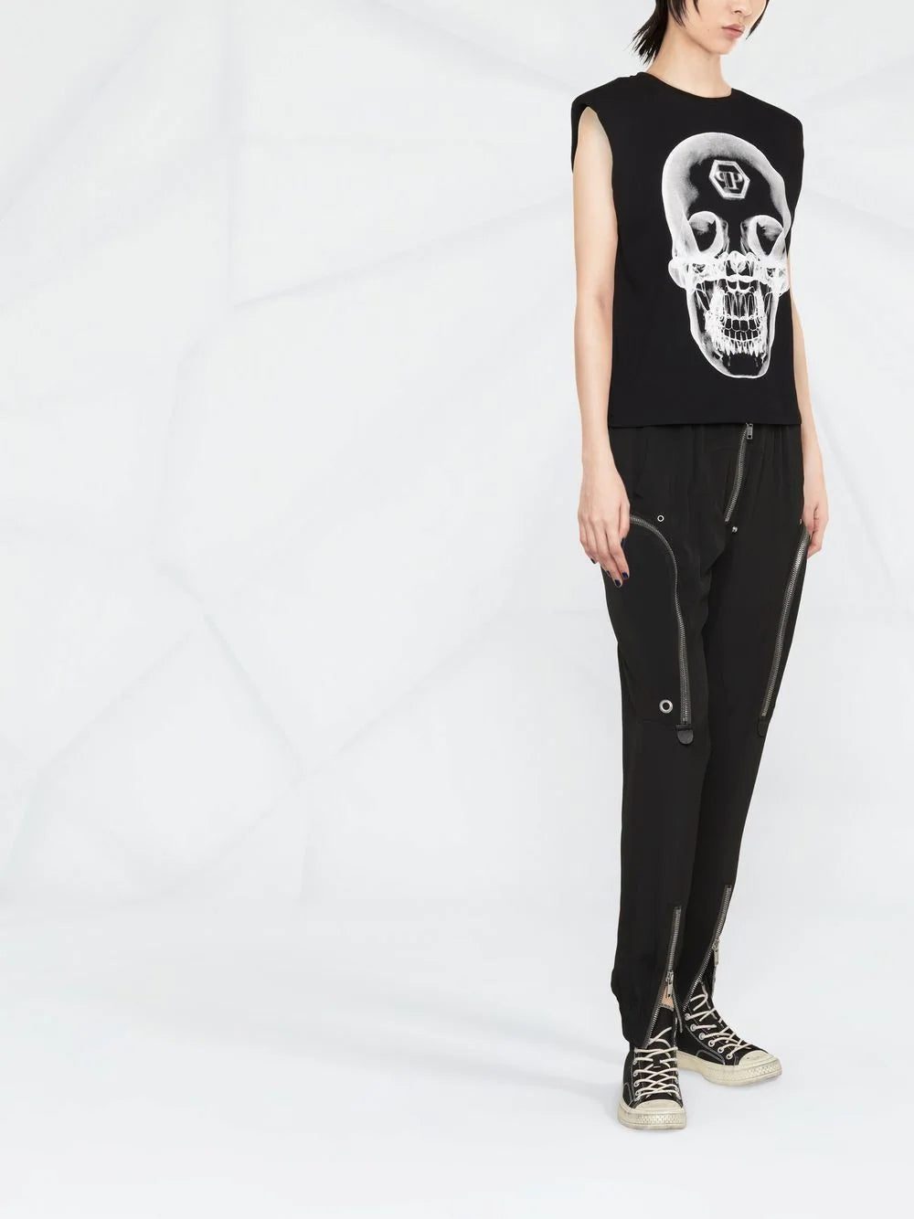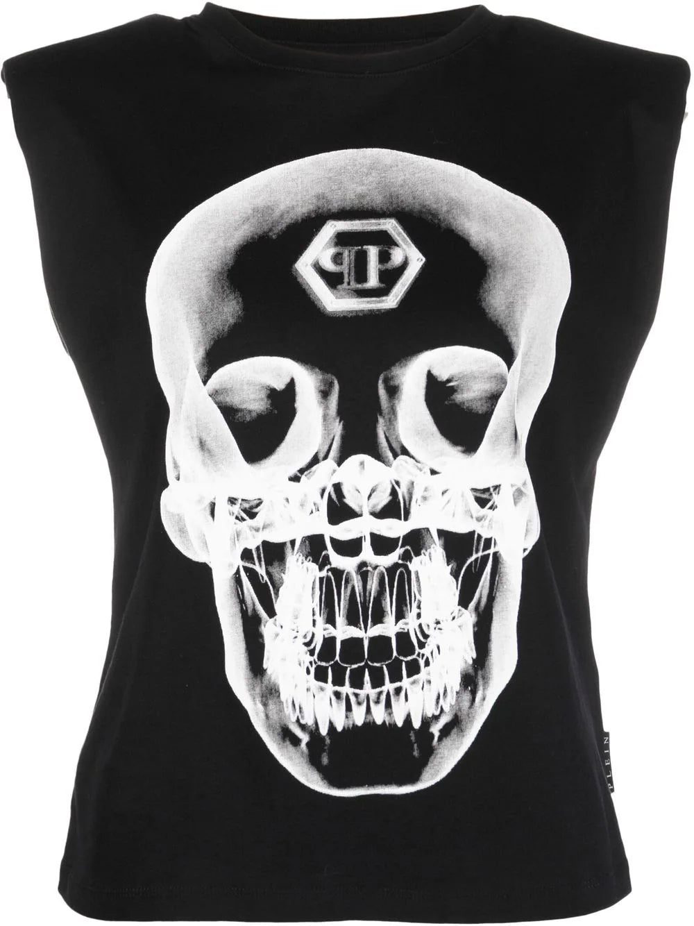 Combining extravagance with refinement, this sleeveless top from Philipp Plein's AW22 collection features a motif print and large graphic print at the front of the design, in the brand's signature monochromatic palette.