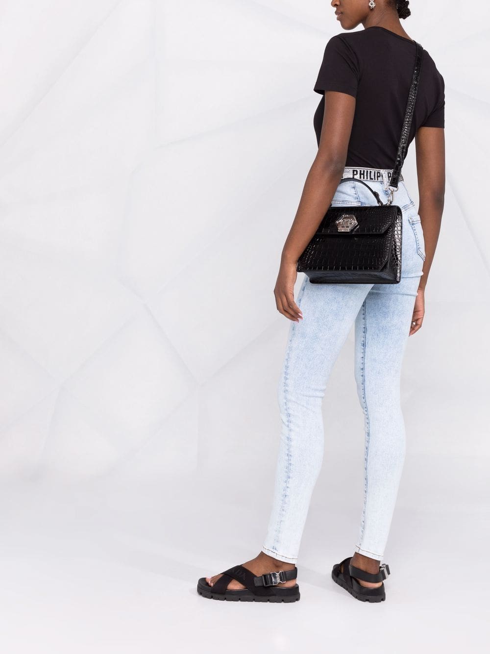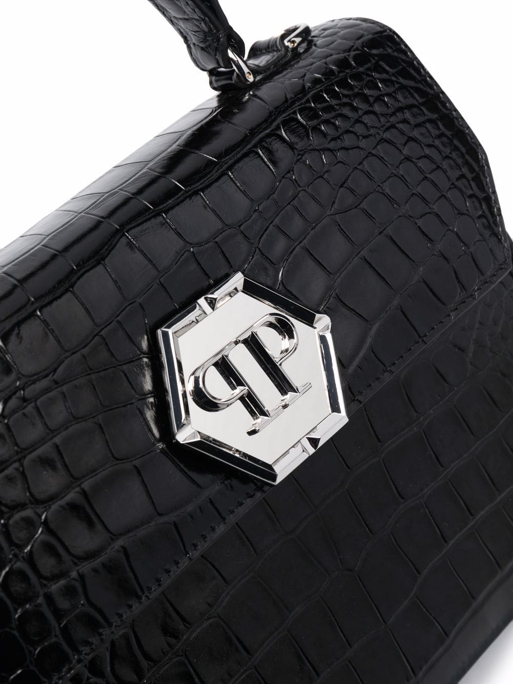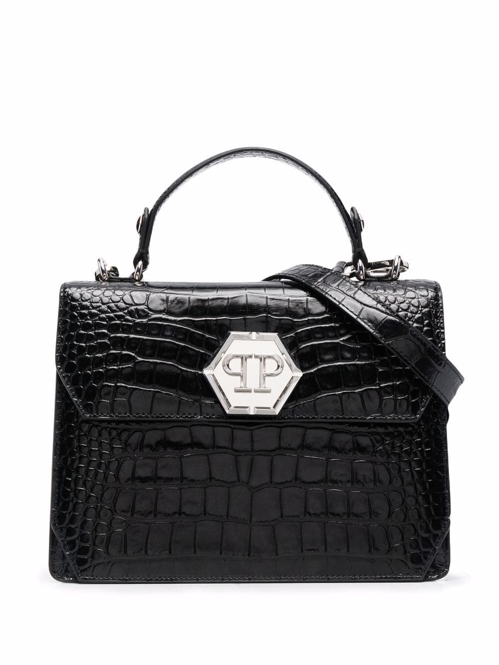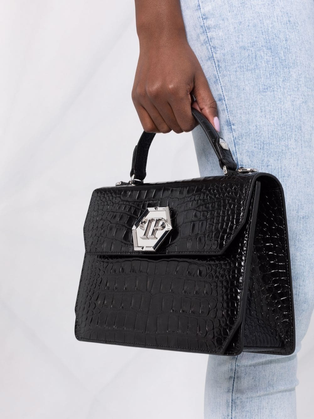 Displaying a boxy silhouette, Philipp Plein's hexagon bag is presented here in a medium size. Enhanced with silver-tone hardware, the classic crocodile-effect of the accessory exhibits the brand's penchant for sleek and structured design.