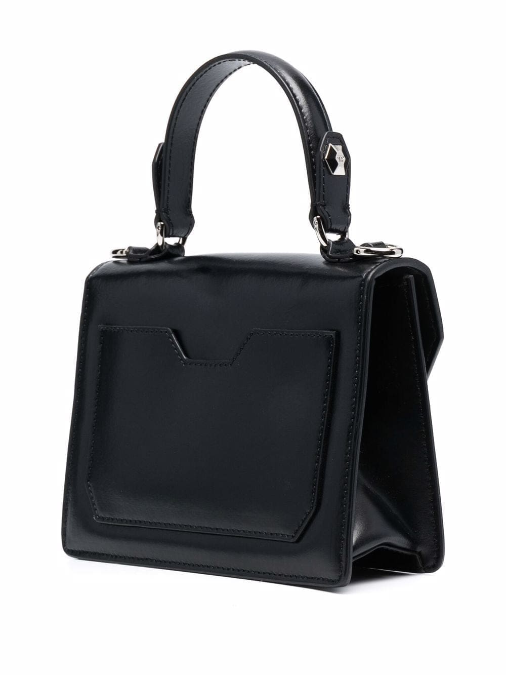 black calf leather logo plaque single flat top handle foldover top adjustable shoulder strap
