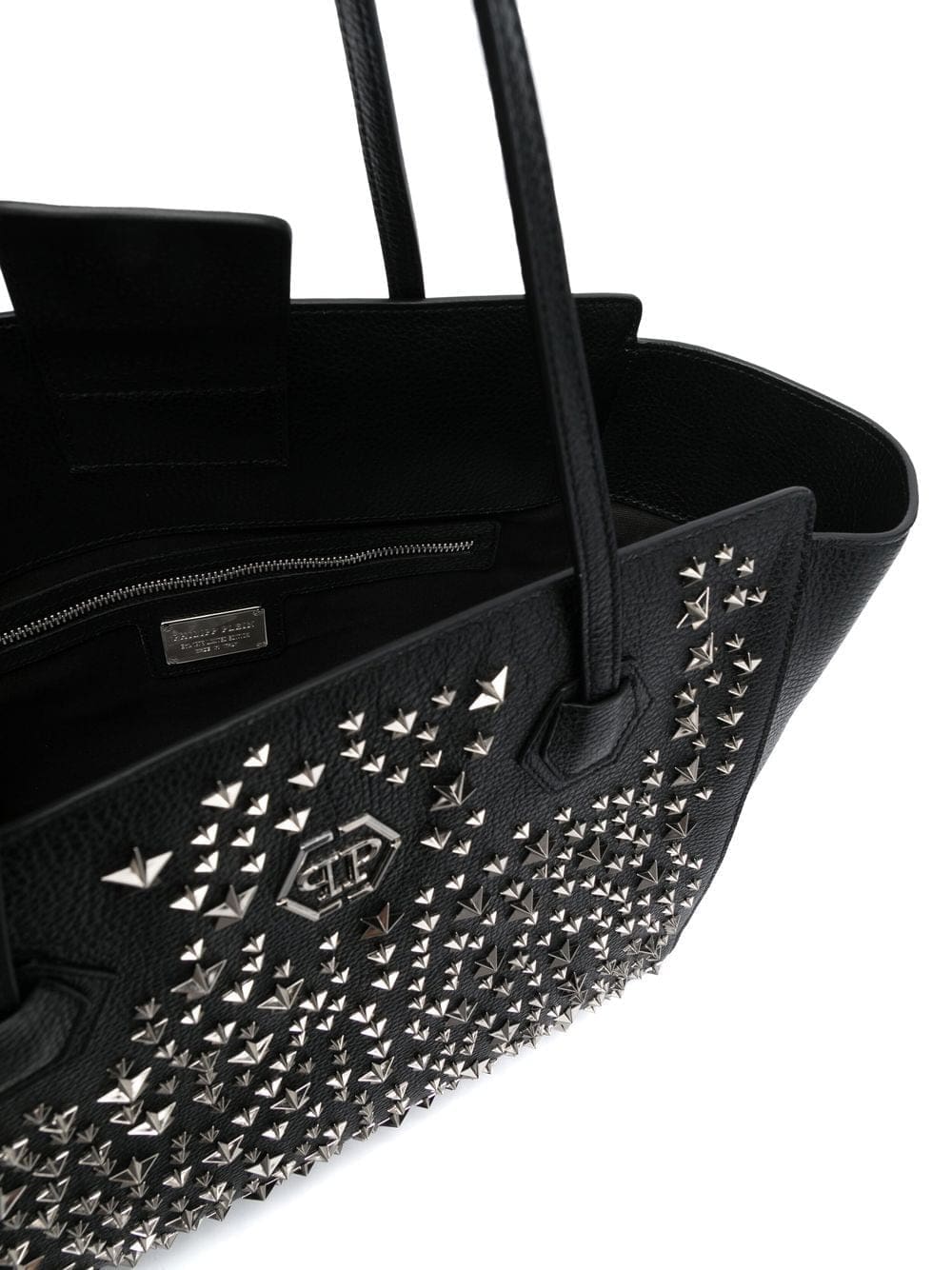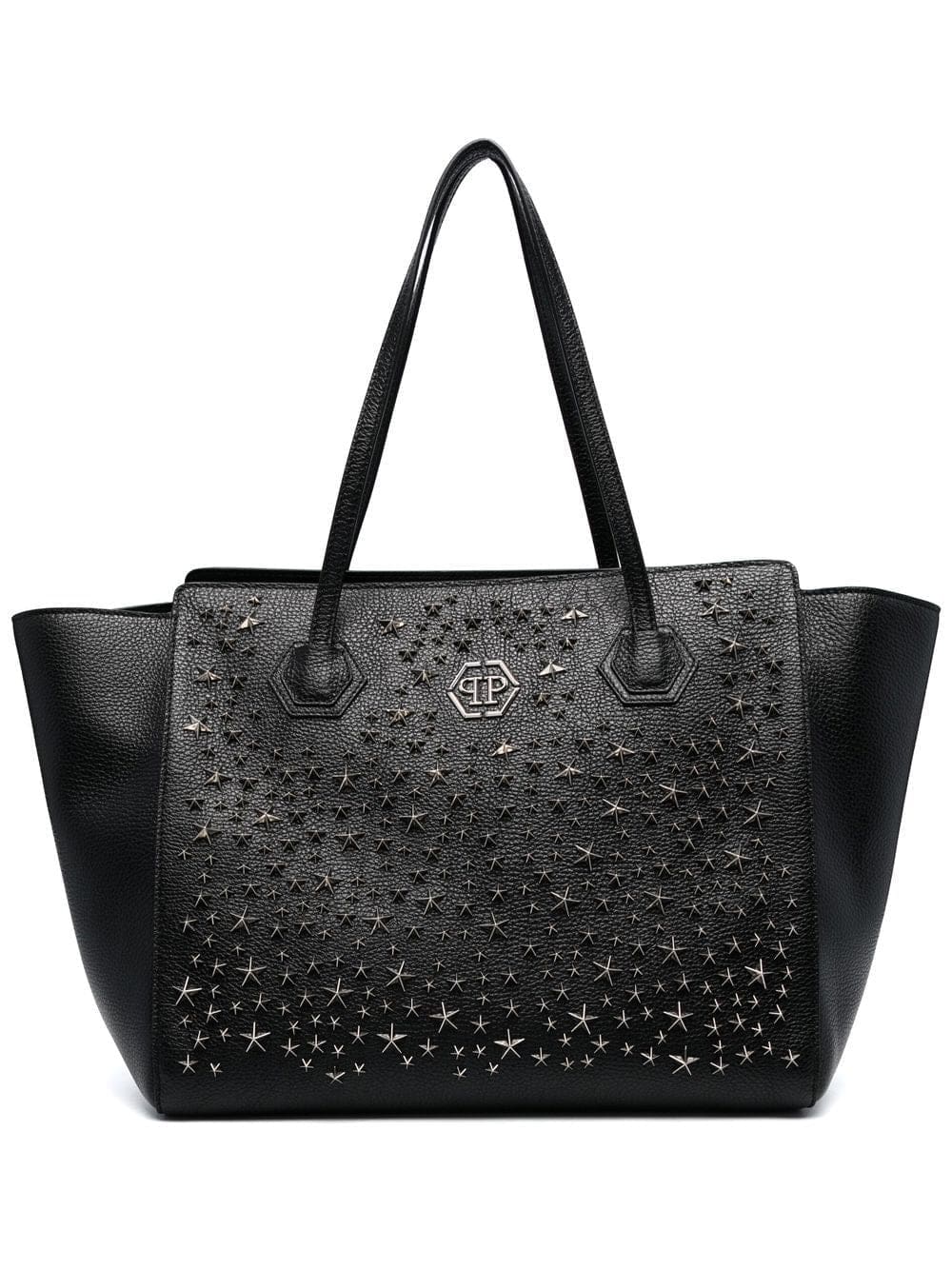 black calf leather star stud embellishment logo plaque main compartment internal zip-fastening pocket internal logo plaque two long top handles