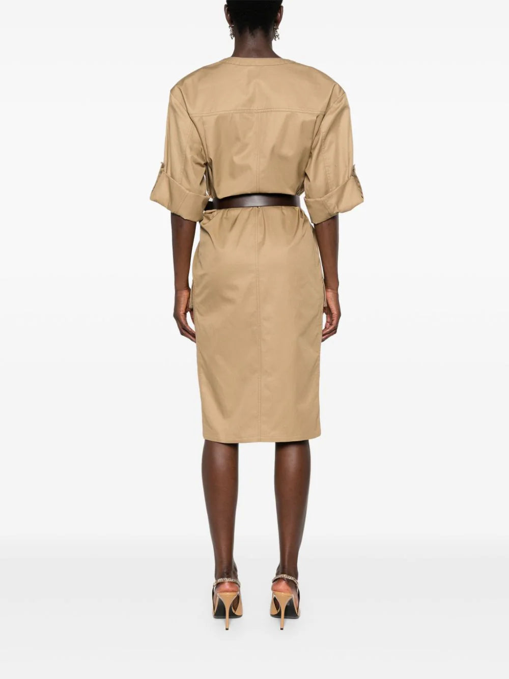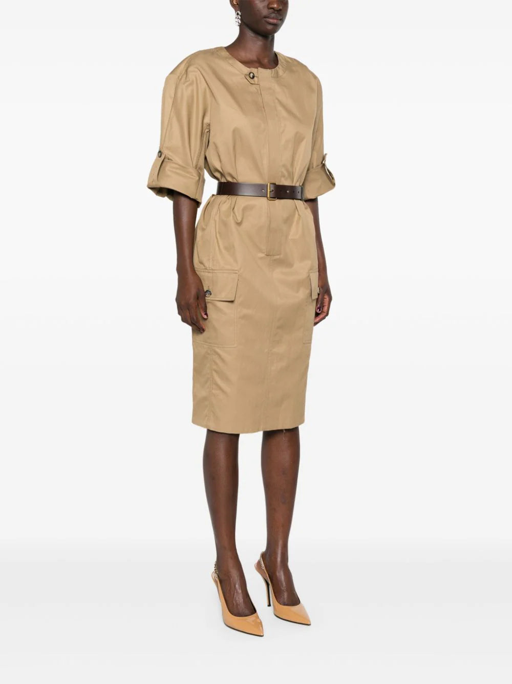 Saint Laurent adds its Parisian aesthetic to this beige dress. The cotton-crafted piece has a shirt silhouette accentuated with a leather belt around the waist.
