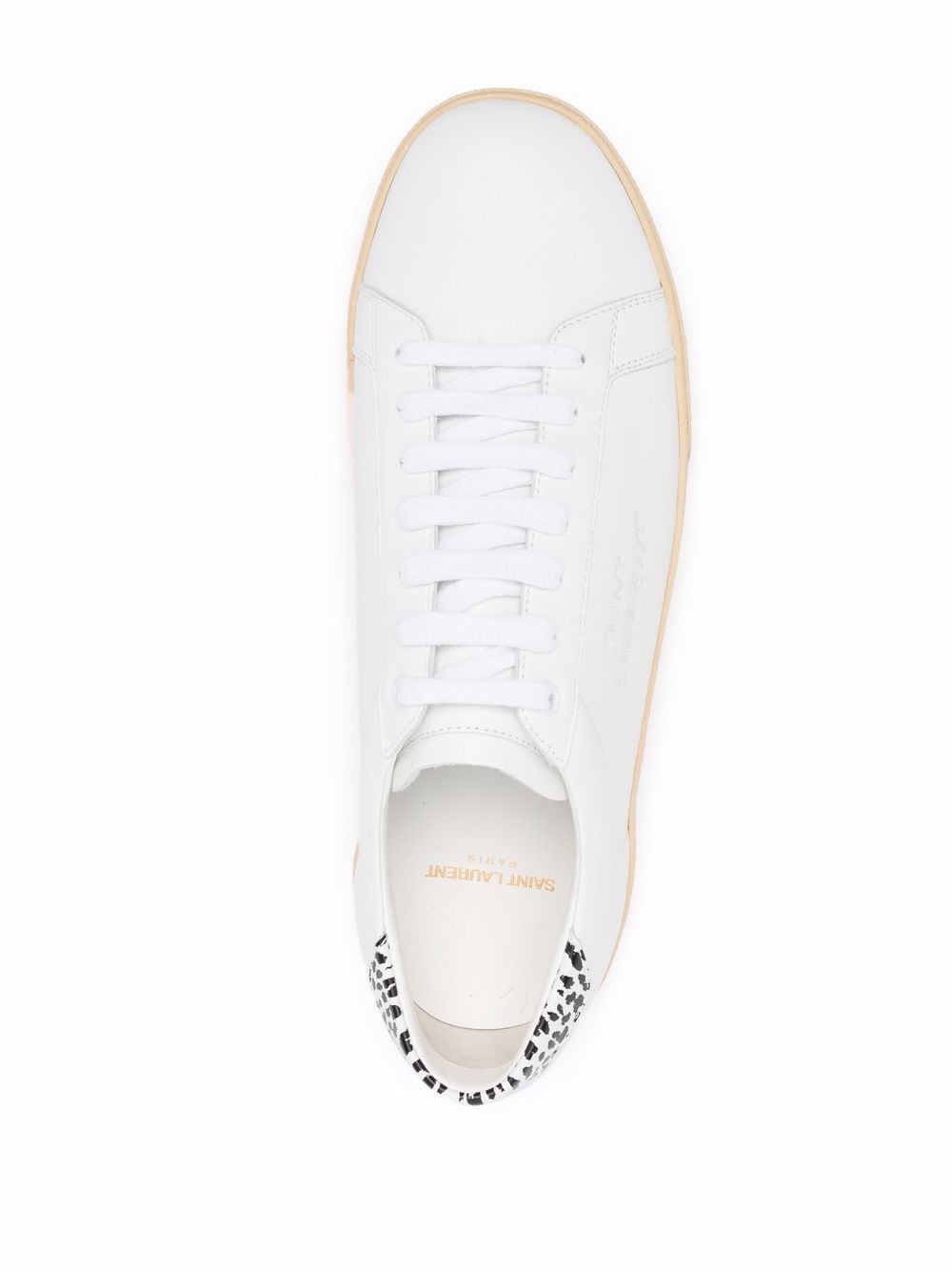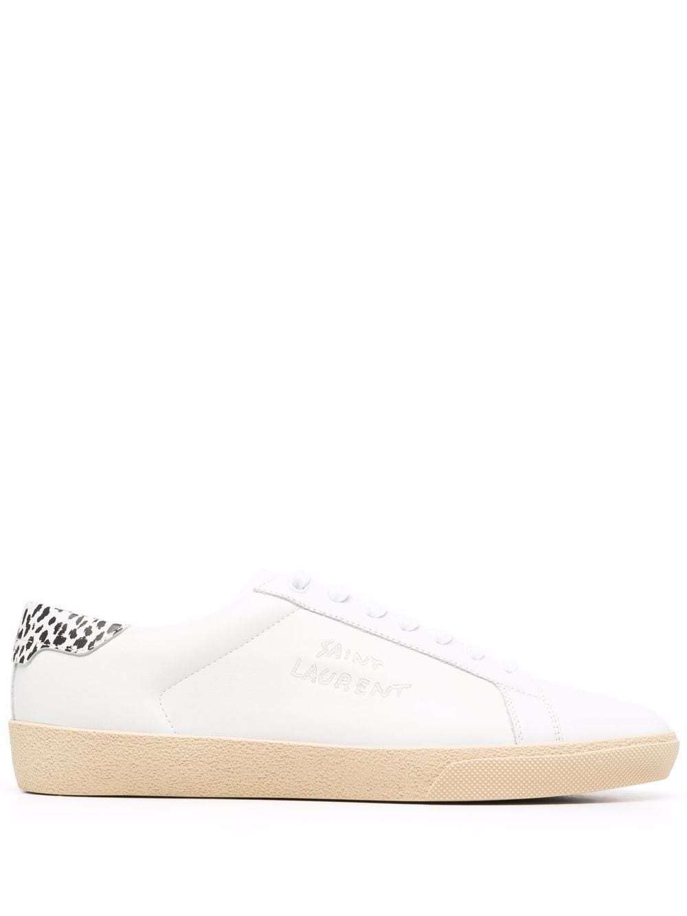 Saint Laurent's subtle Parisian style with a distinct edge is demonstrated in the panelled design of these low-top sneakers. Crafted from white leather, they are designed with a leopard-print heel counter and embroidered logo to the side.Â