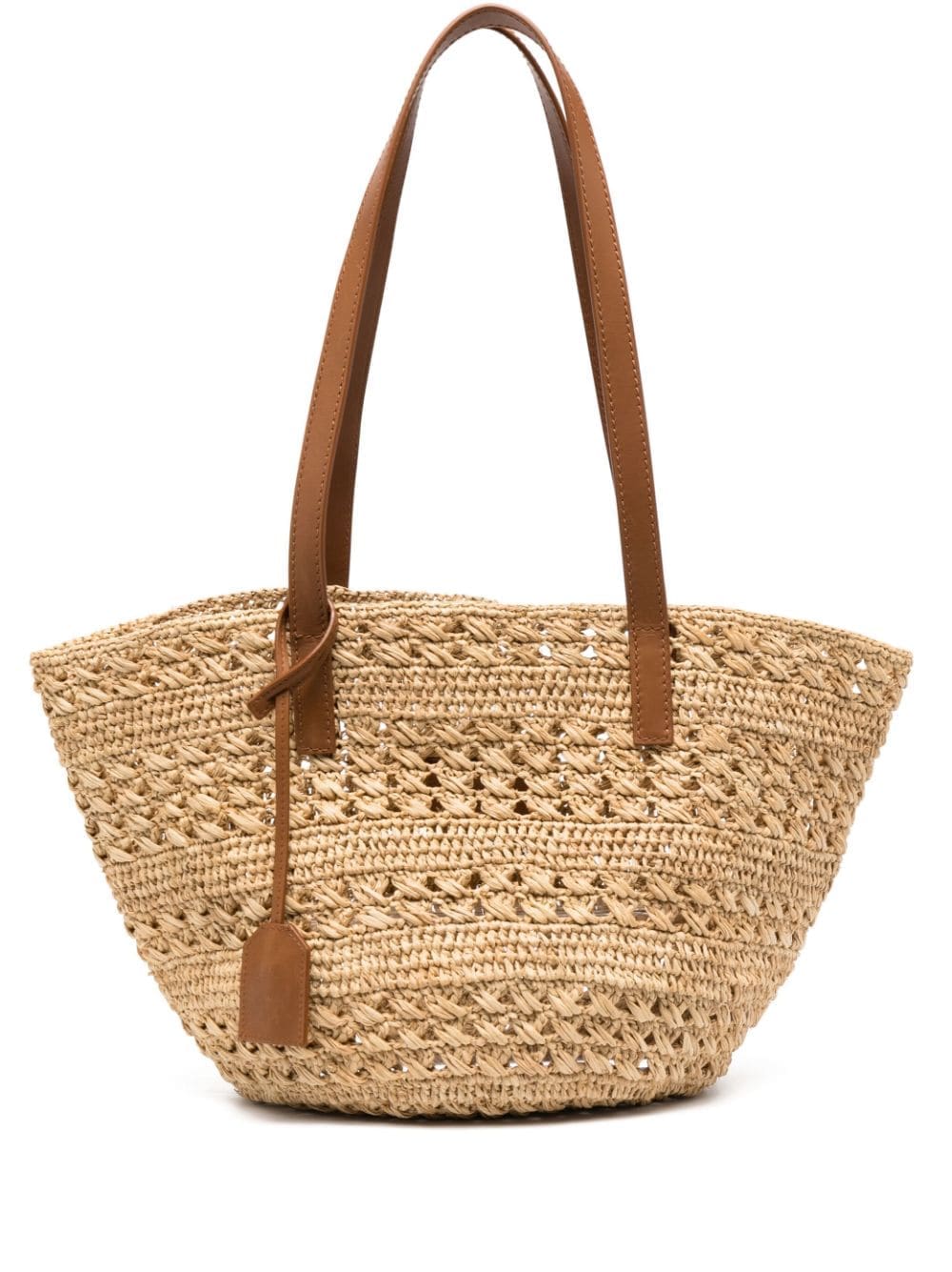 This tote bag by Saint Laurent is crafted from natural, summery raffia in a woven, crochet construction. Held by two leather top handles, it boasts a spacious silhouette to carry your essentials and is decorated with a leather logo tag.