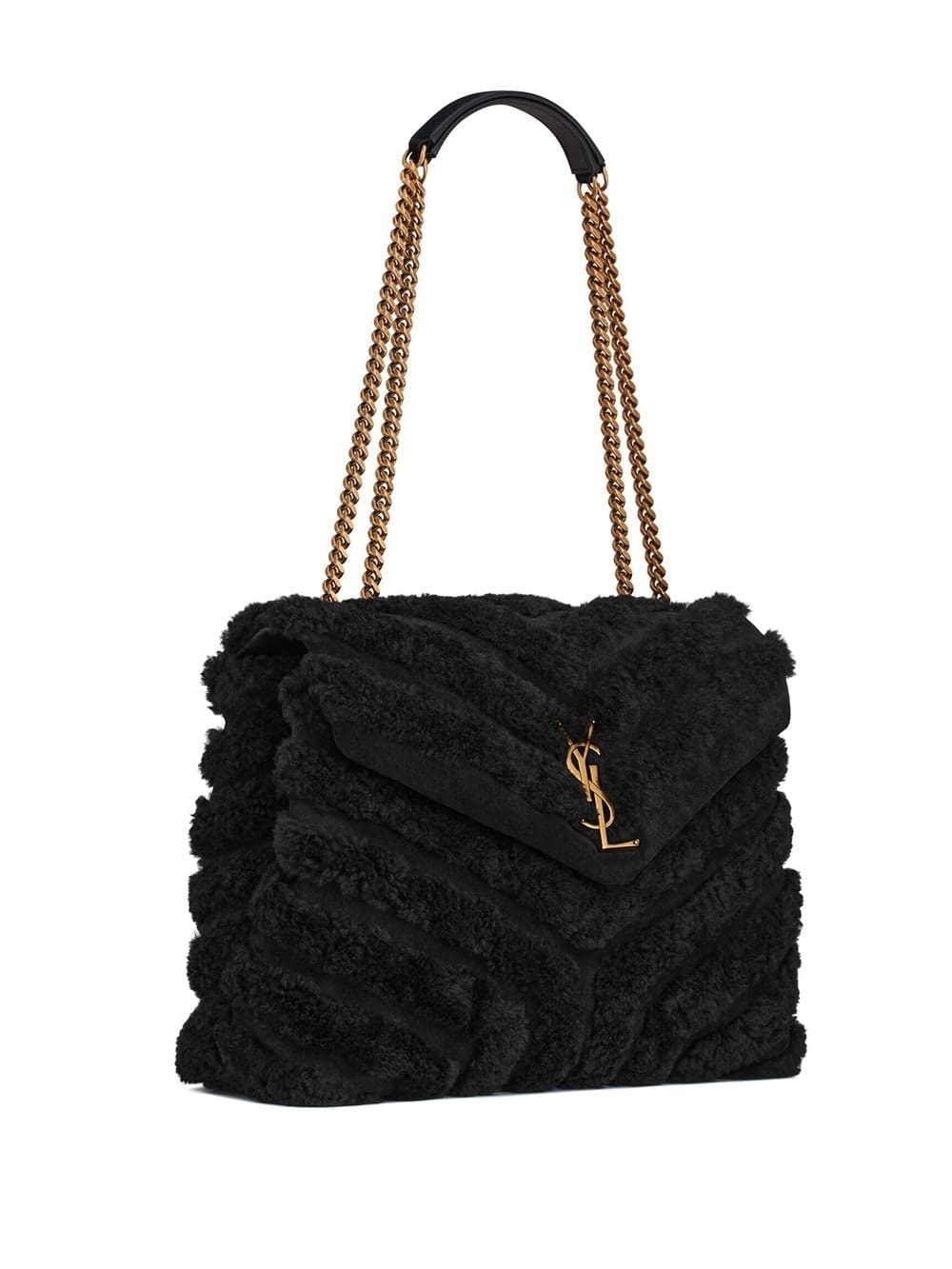 black sheepskin gold-tone logo plaque quilted finish shearling monogram gold-tone hardware front flap closure concealed magnetic fastening leather and chain-link top handle main compartment