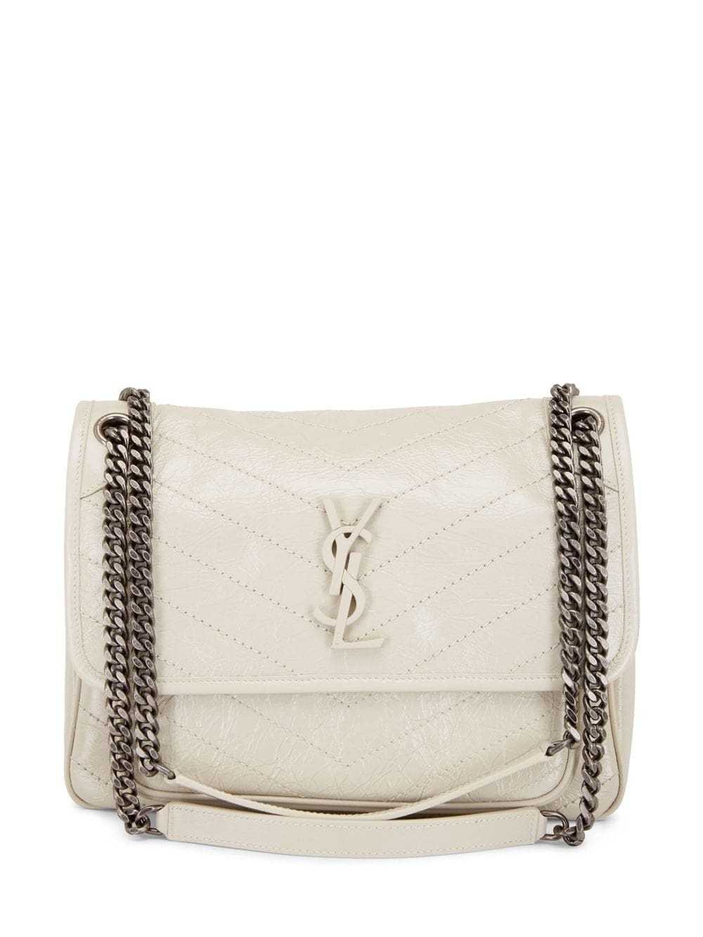 The design of Saint Laurent's Niki shoulder bag echoes the maison's sophisticated spirit. Crafted in a soft off-white hue for a contemporary appeal, it is simply finished with a tonal YSL plaque in line with the brand's minimalist approach.