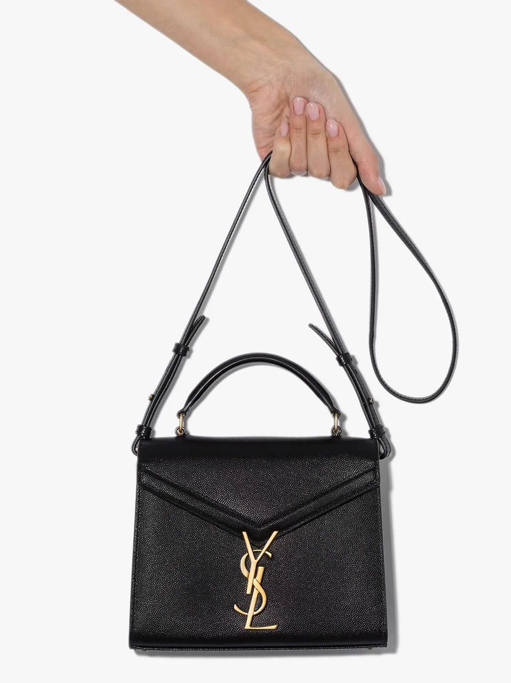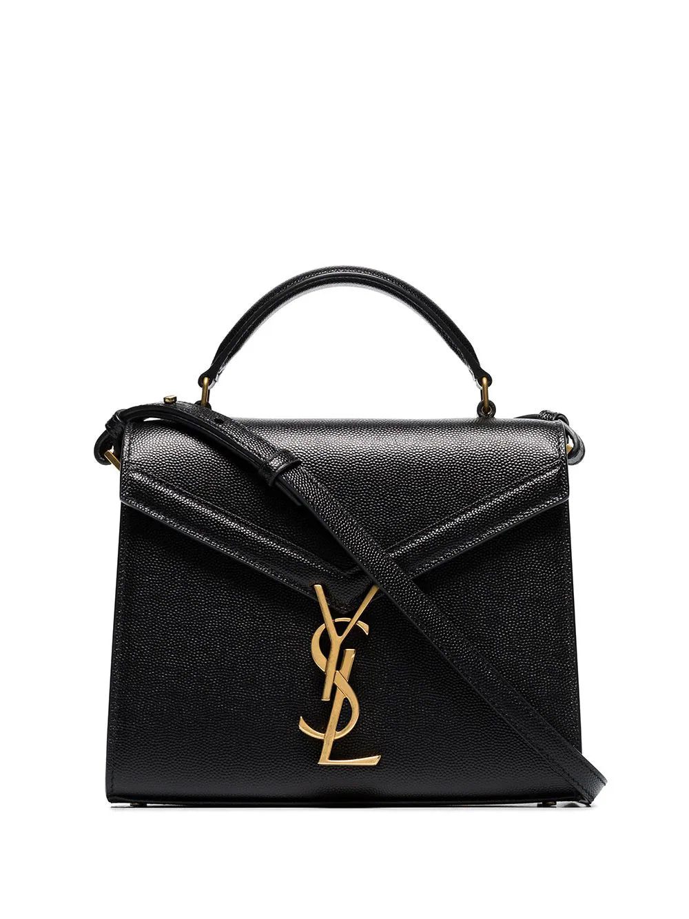 Size doesn't matter. But mini-bags do. Specifically, this black leather mini Cassandra crossbody bag from Saint Laurent. All hail the Queen (of mini accessories). Featuring gold-tone hardware, a round top handle, an adjustable shoulder strap, a foldover top and a front logo plaque.
