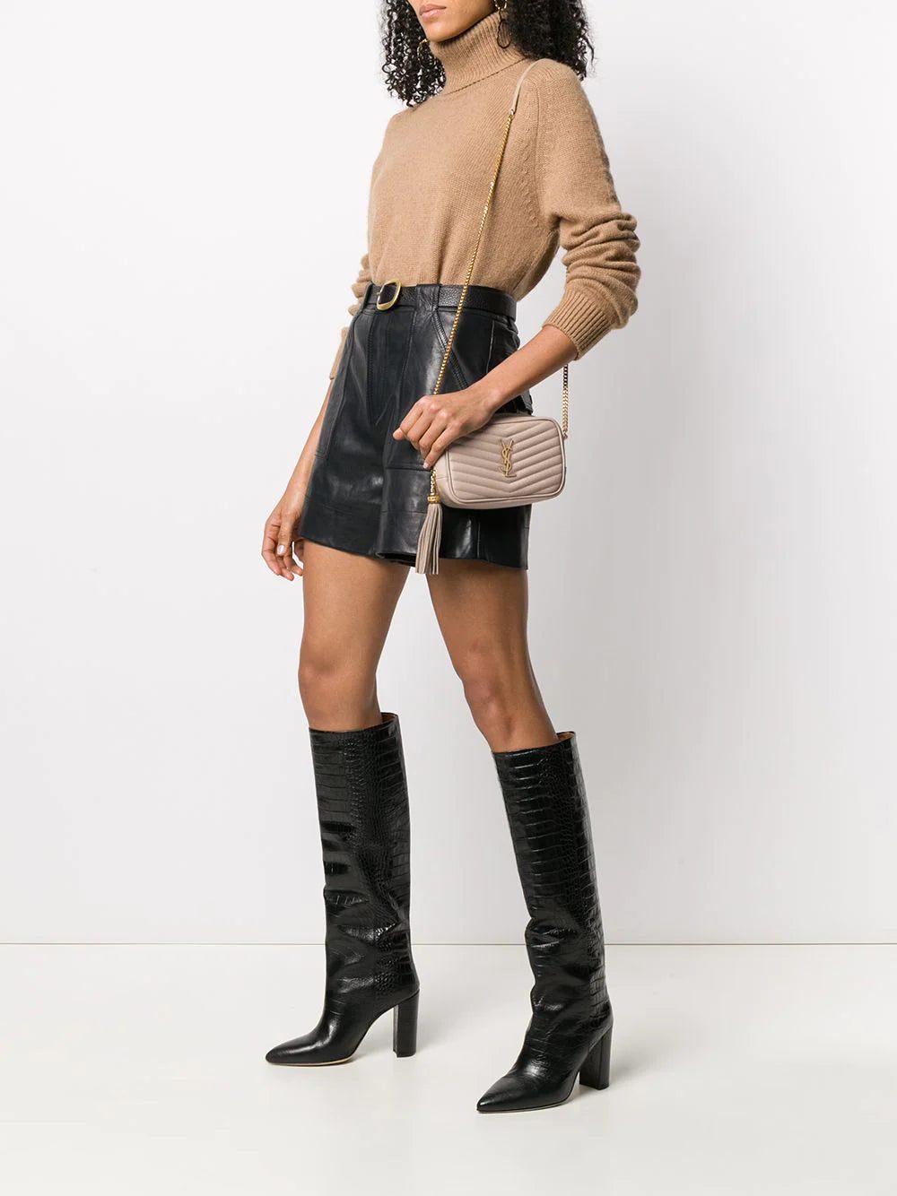Dark beige calf leather quilted logo shoulder bag from Saint Laurent featuring gold-tone hardware, a quilted effect, a front logo plaque, a hanging tassel, a top zip fastening, a chain strap, a main internal compartment and a full lining.