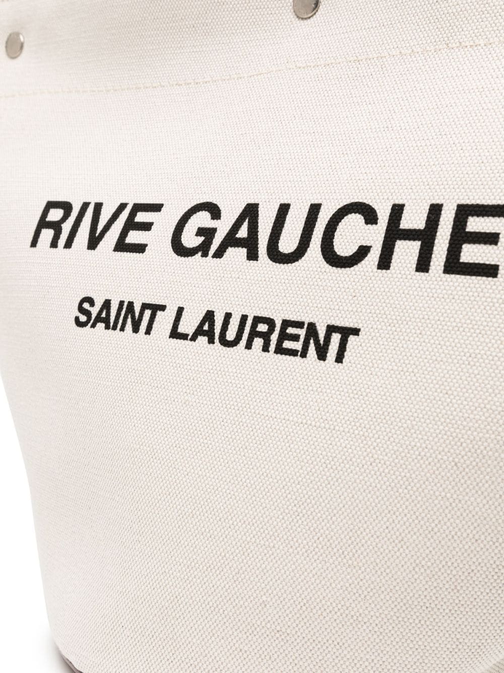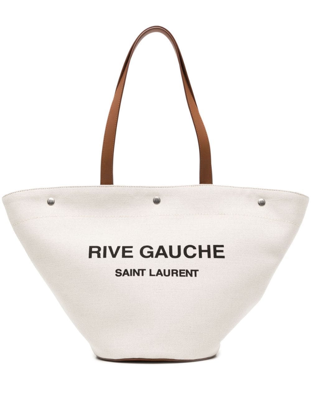 Understated tones create a refined look for this Rive Gauche tote bag from Saint Laurent. Atop an off-white colourway on the body, light brown top handles bring a pared-back contrast. The brand's logo stands out printed in black.