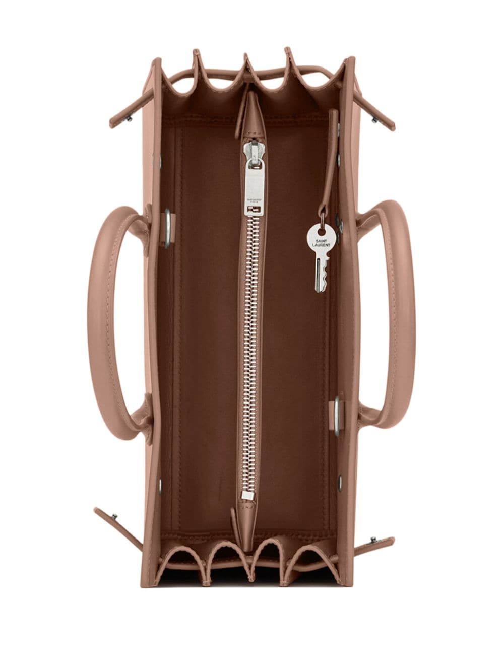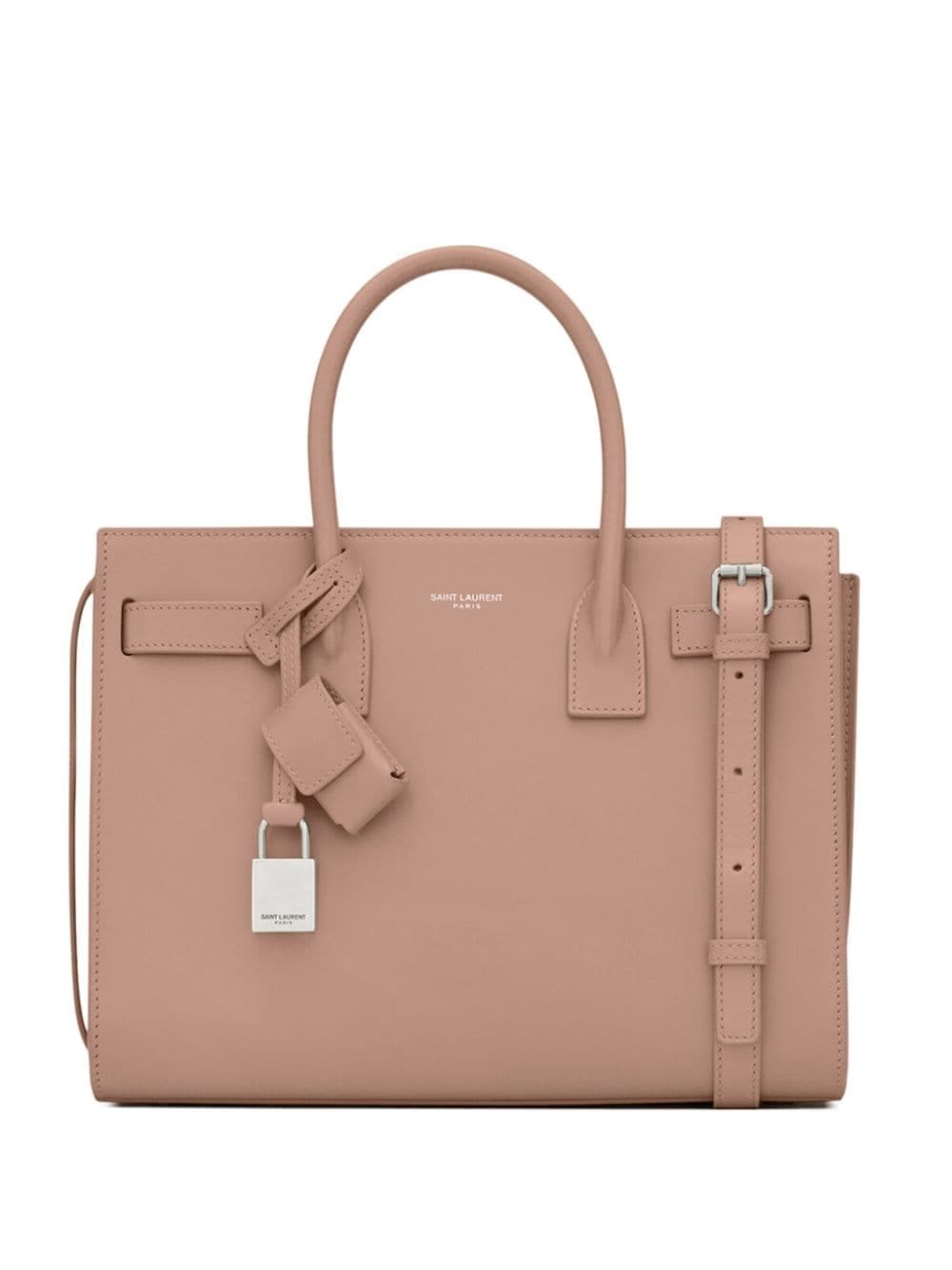 Saint Laurent's celebrated Sac De Jour bag is set apart by its shape and signature details: it's crafted to a structured silhouette with accordion sides and a detachable padlock housed in a case. This one comes in blush pink leather with a logo print in gold foil at the front.