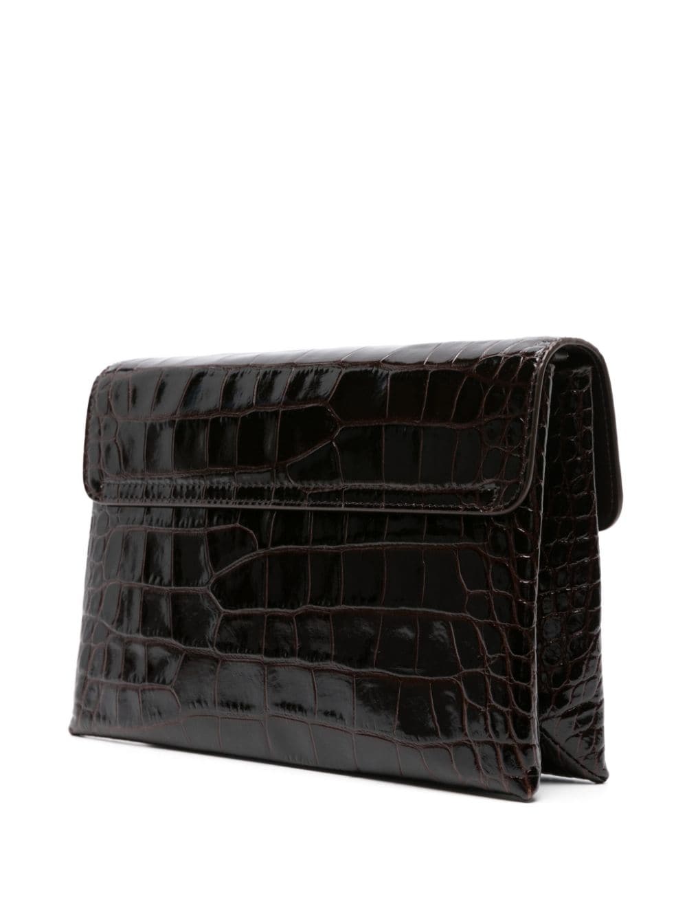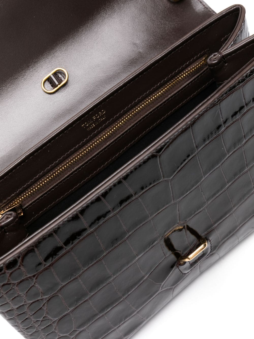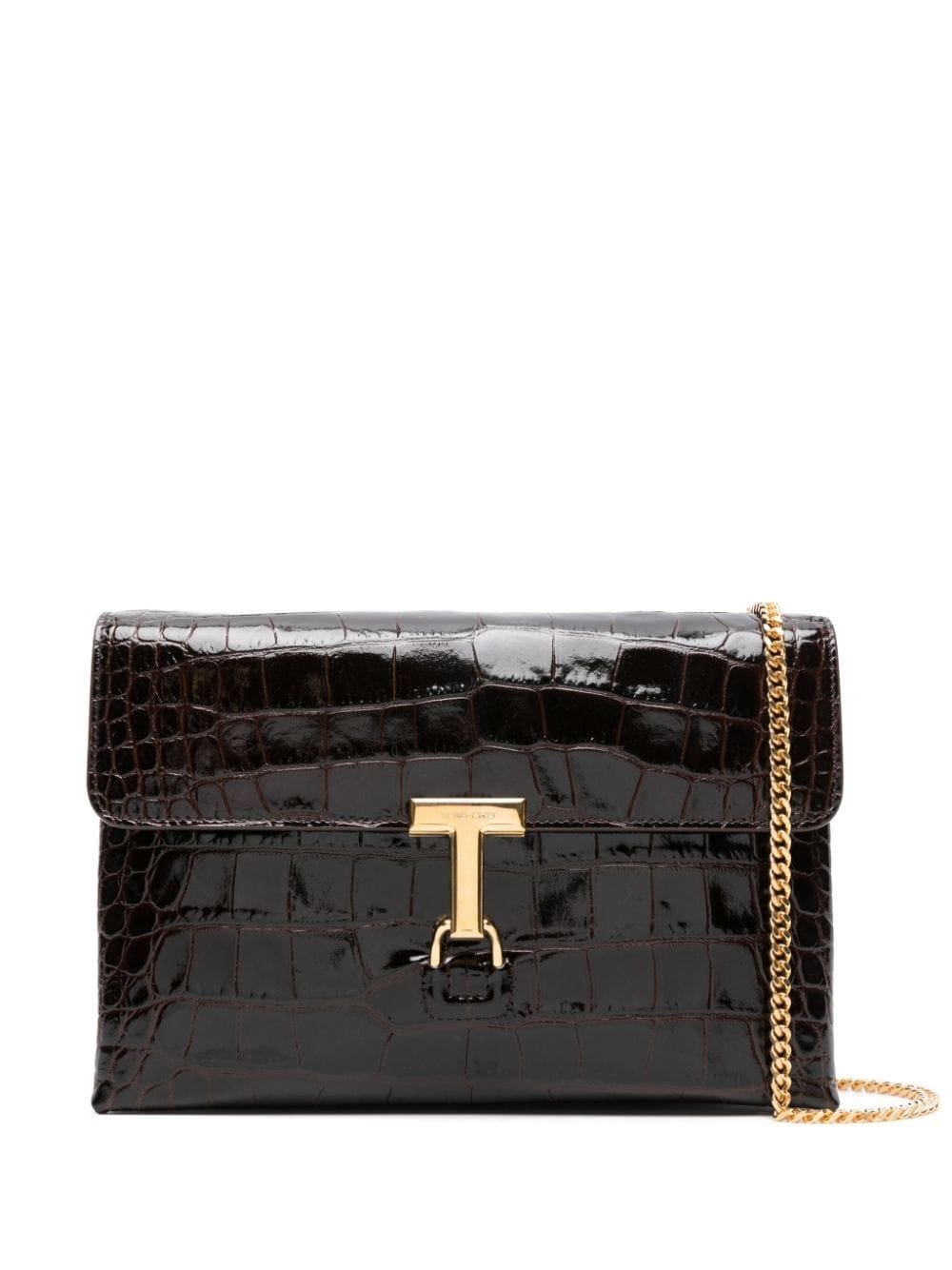 TOM FORD’s Monarch bag is crafted from glossy dark-brown leather embossed with realistic crocodile scales. The gold-tone T hardware at the front acts as the clasp fastening in both branded and functional detail.