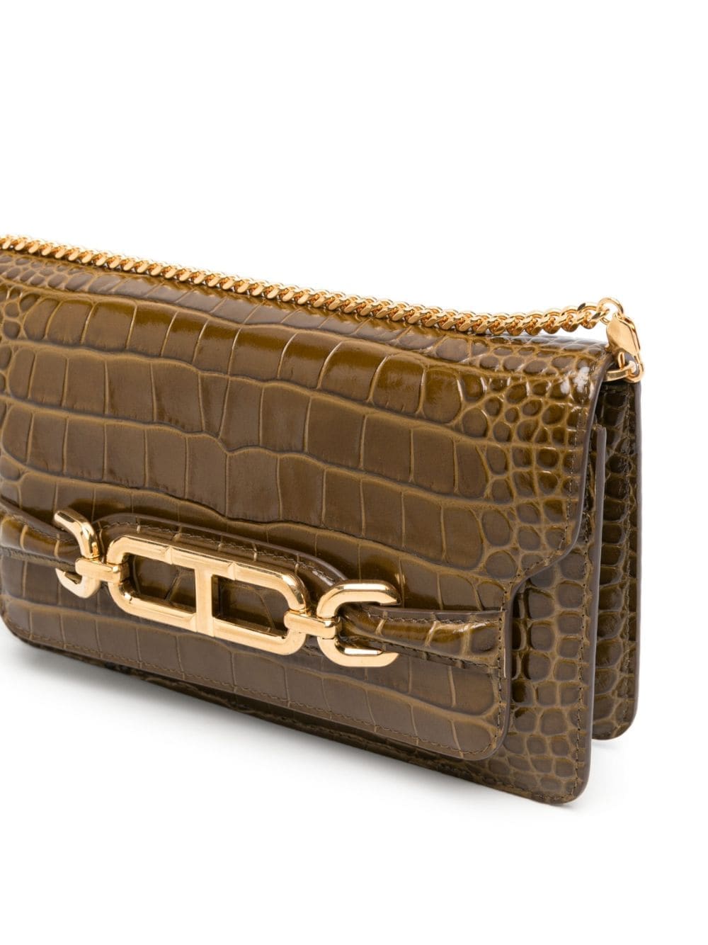TOM FORD’s Whitney bag is crafted from khaki leather with a crocodile effect, reflecting the brand’s affinity for tactile textures. It’s suspended by a slender chain-link strap and adorned with coordinating gold-tone hardware at the front.