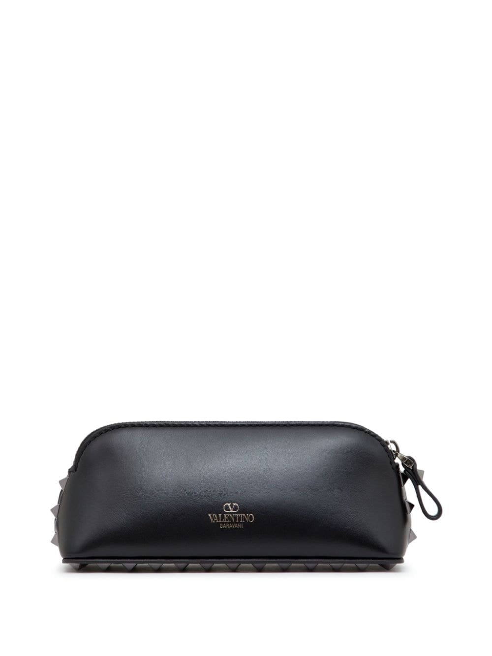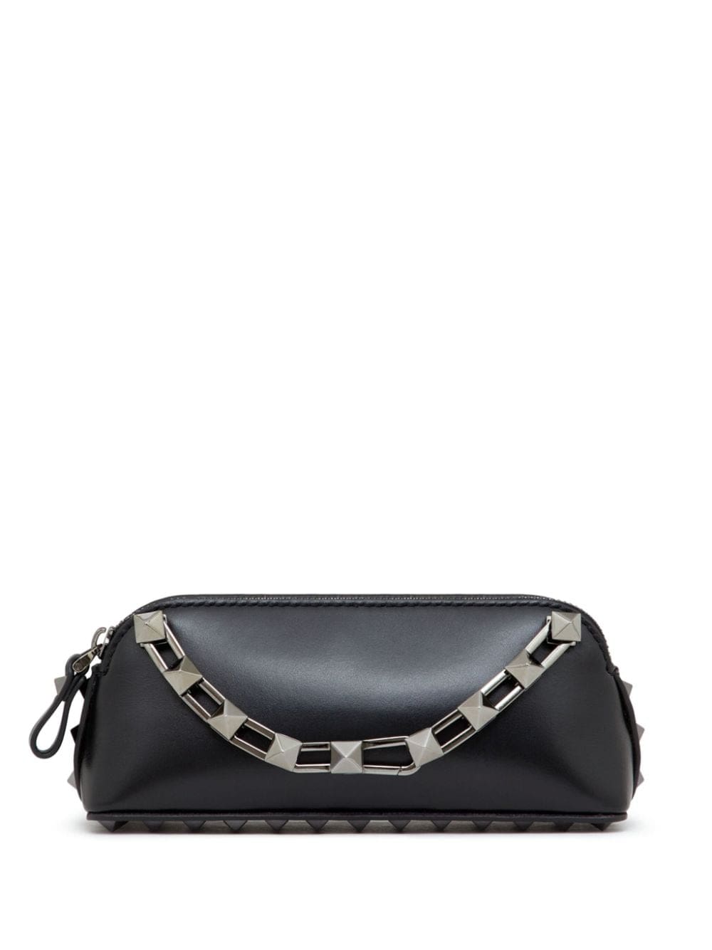 Crafted from smooth black lambskin leather, this triangular mini bag from Valentino Garavani has been adorned with the brand's signature Rockstud embellishments and a sleek silver-tone chain.
