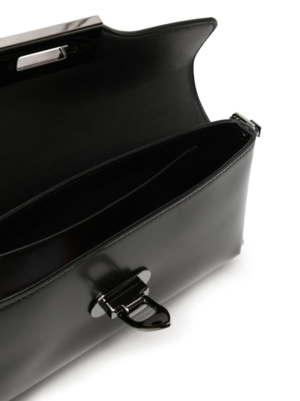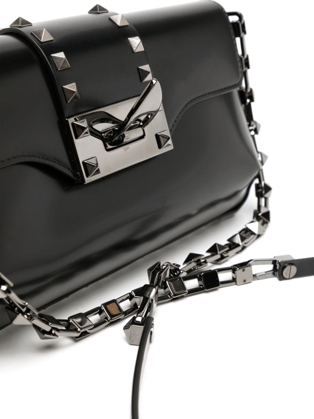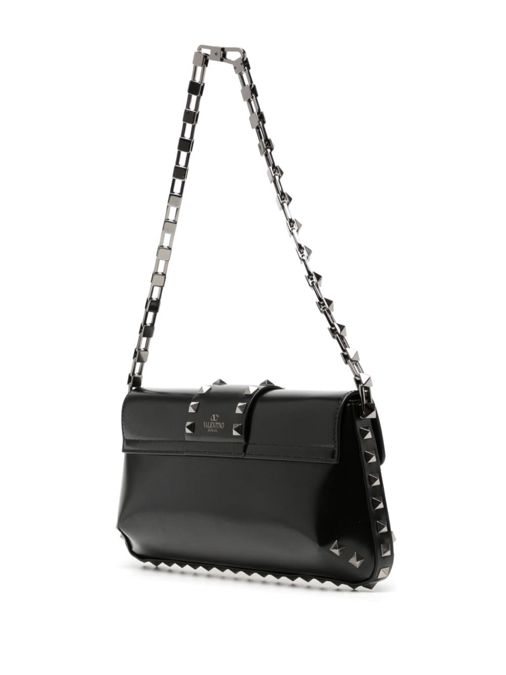 First appearing in 2010, the Rockstud has since become a signature embellishment for Valentino Garavani. Here, the silver-tone stud decorates the shoulder strap and the front flap of this black leather bag.