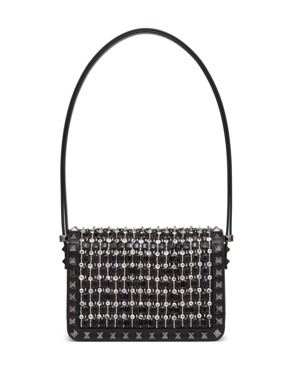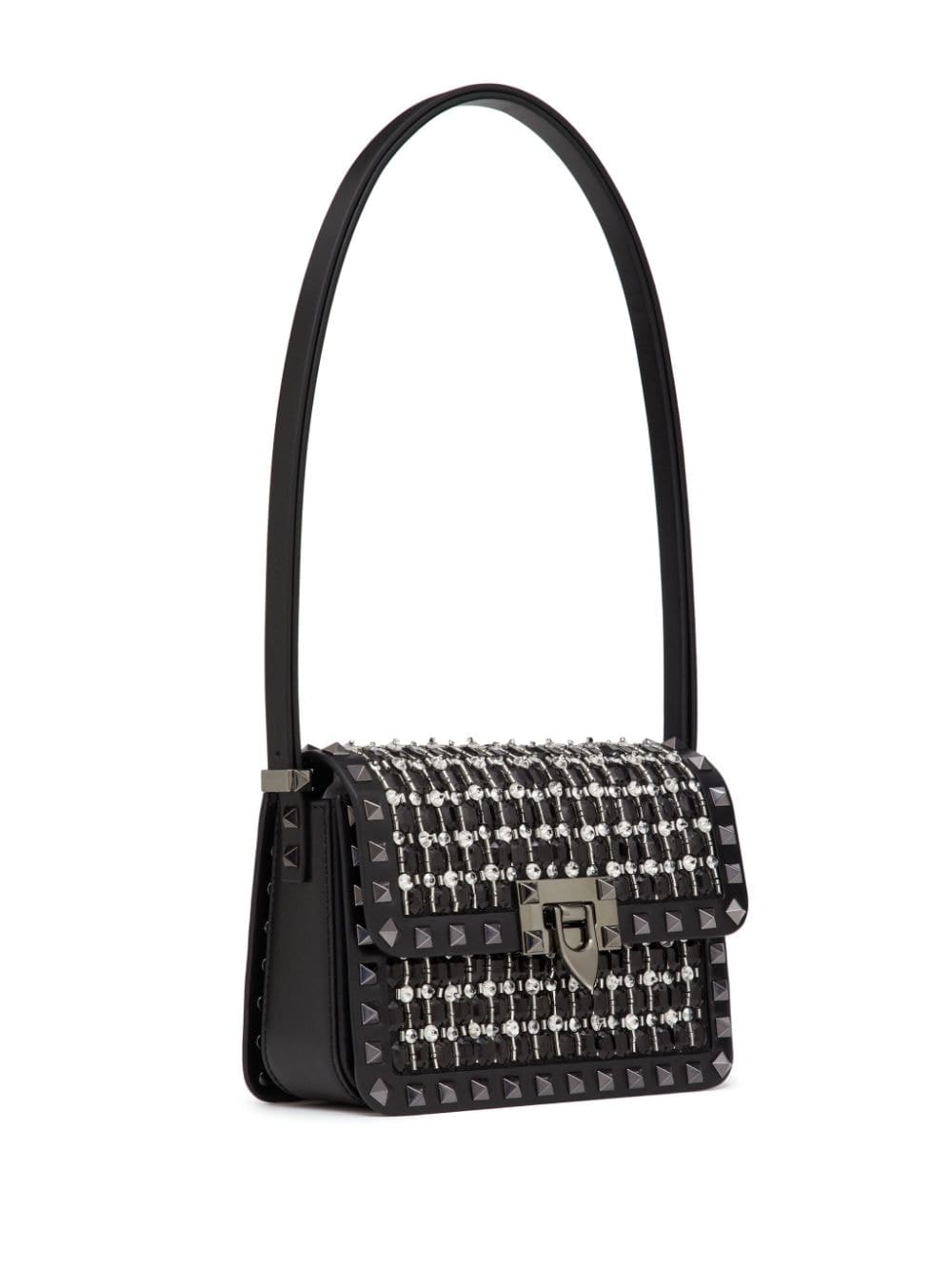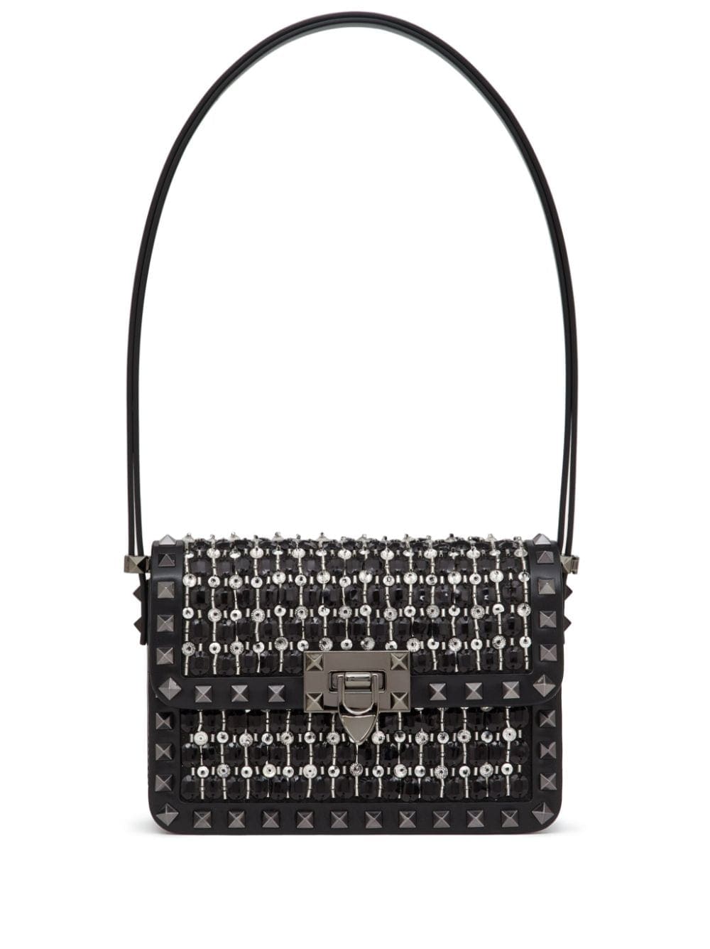 This Valentino Garavani shoulder bag is crafted from black leather and fitted with glimmering crystals. Lines of Rockstuds border the compact design, lending a distinctive finishing touch.