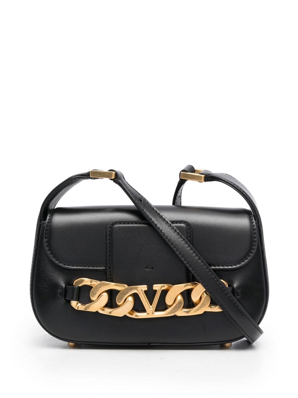 Decorated with a gold-tone chain-link VLogo to its front, this sleek bag by Valentino Garavani is crafted in a smooth calf leather construction. Showcasing a curved silhouette, the elegant design is suspended from an adjustable single top handle.
