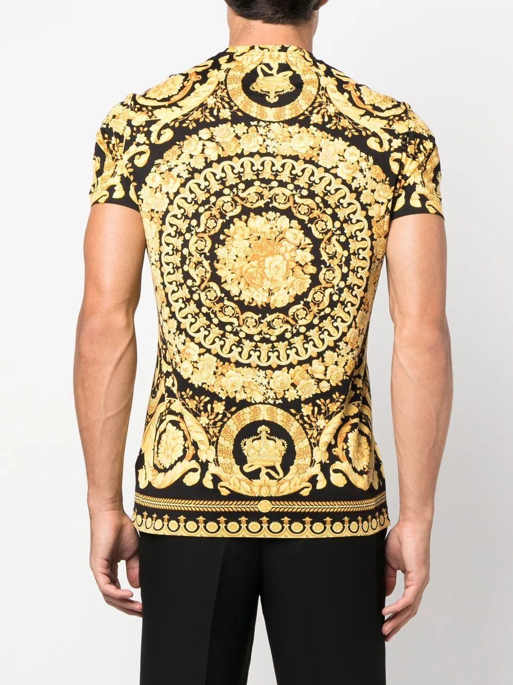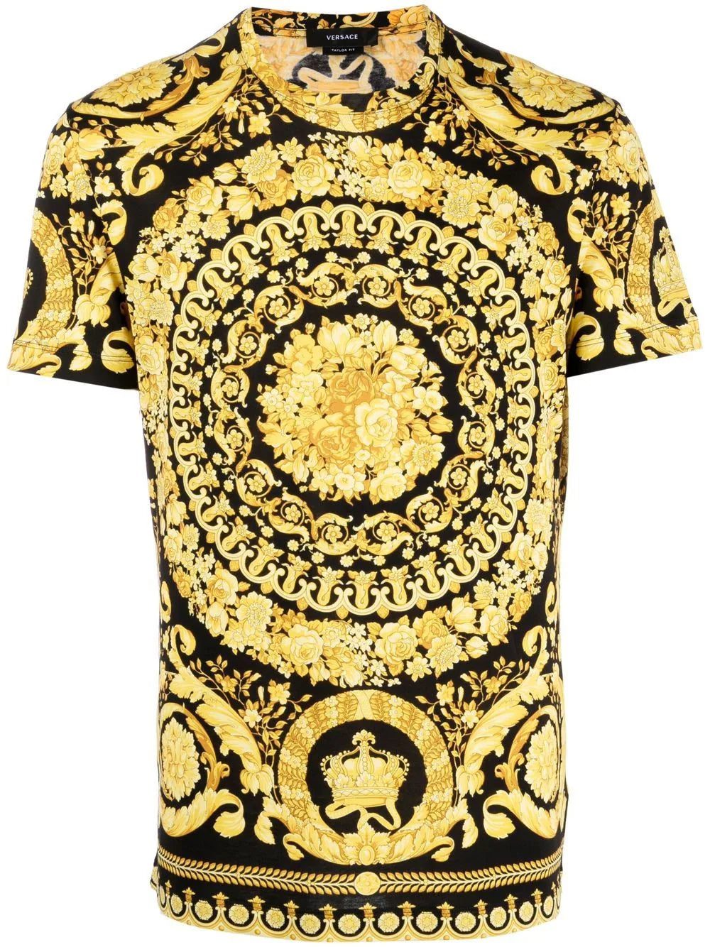Barocco-print organic cotton T-shirt from VERSACE featuring gold-tone, black, organic cotton, signature Barocco print, round neck, short sleeves and straight hem. Conscious: This item is made from at least 50% organic materials.
