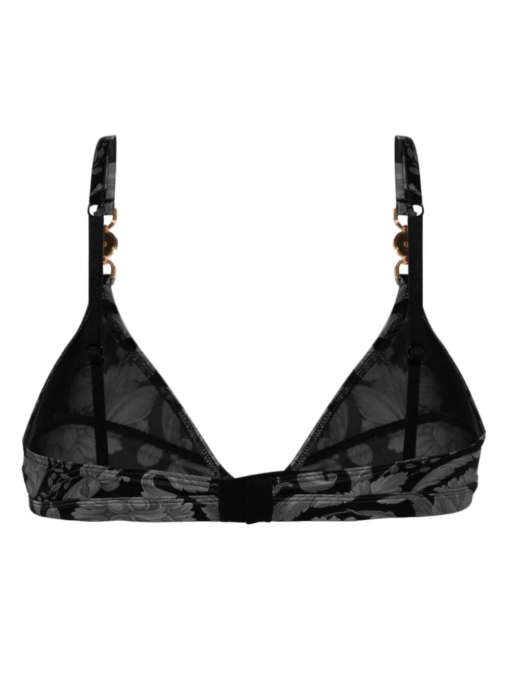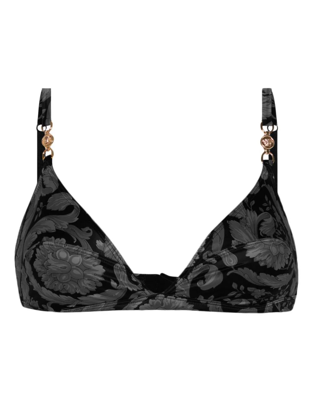 Versace's triangle cup bra is saturated with branded details including the signature Barocco print and the Medusa Head — a ubiquitous motif that highlights the label's fascination with Greek mythology.