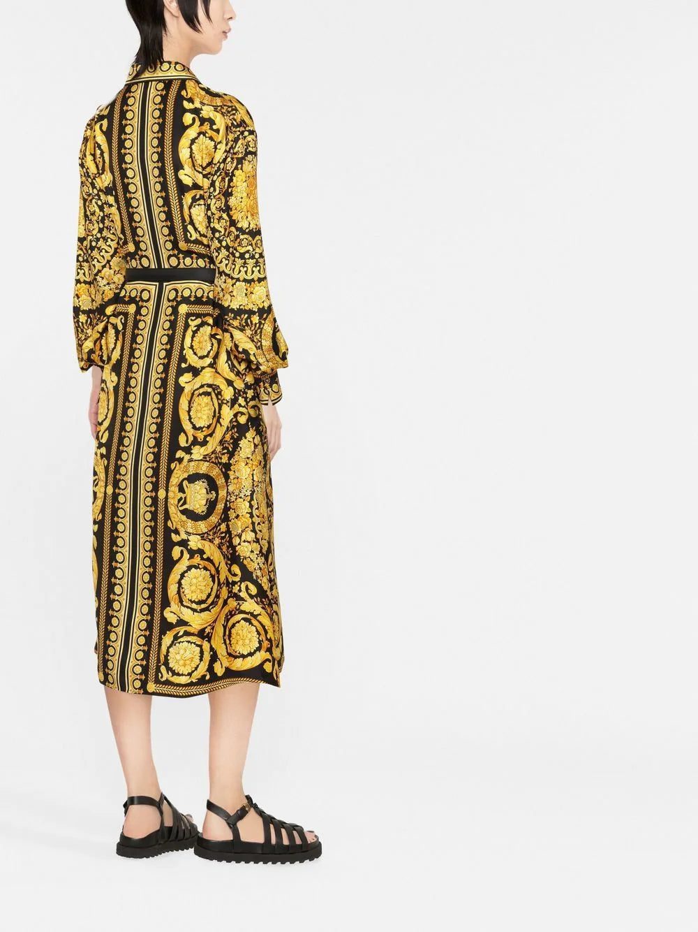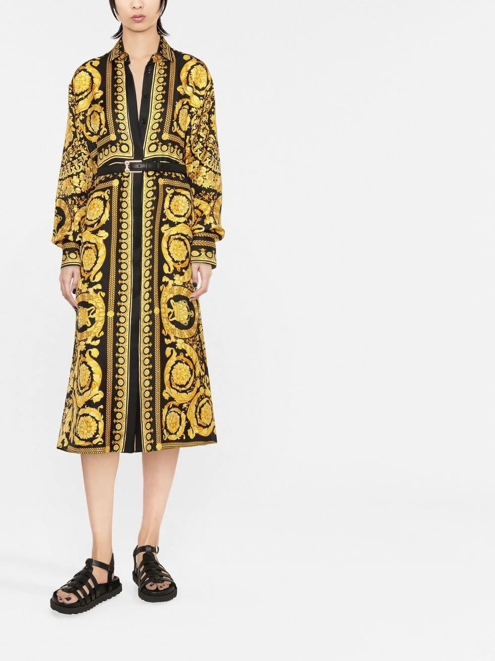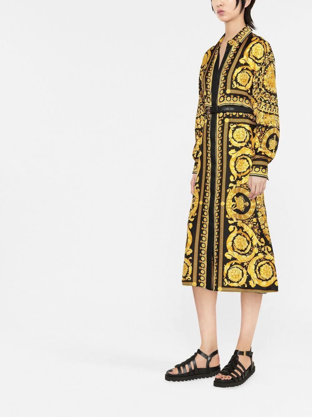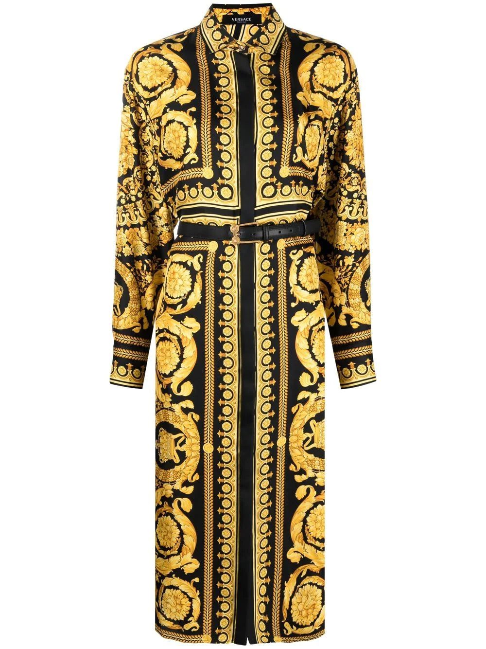 baroque-print belted shirt dress from VERSACE featuring black, silk, calf leather, baroque-pattern print, embossed gold-tone buttons, Medusa Head motif, classic collar, concealed front fastening, belted waist, long sleeves, buttoned cuffs, straight hem and long length.