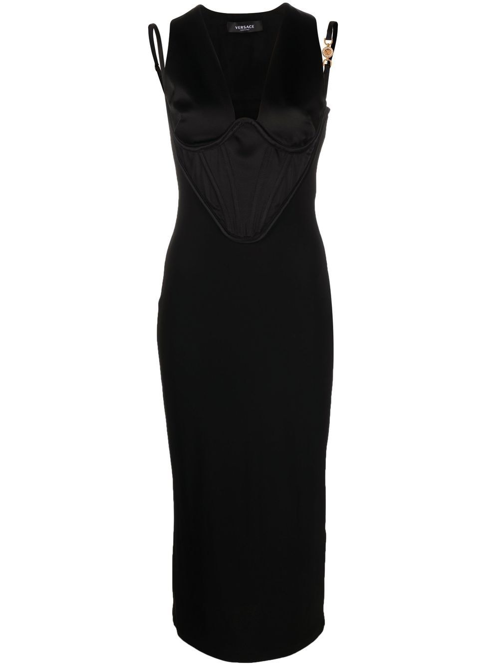Lending a nod to archival atelier styles, this Versace dress is characterised by its V-shaped boning and corsetry-inspired construction. Presented in a black hue, it's brought to life by the crystal-adorned Medusa motif that decorates its left shoulder strap.