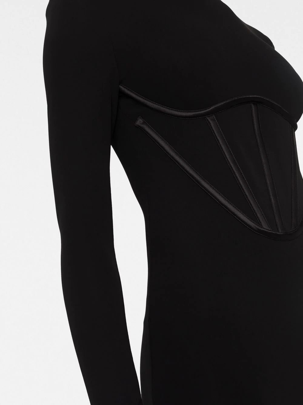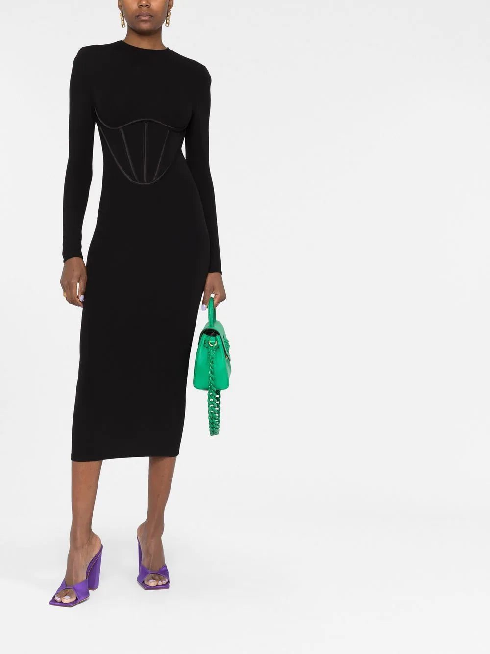 Versace forgoes bold branding in favour of a striking silhouette with this mid-length dress for AW22. This design is characterised by a corset-style construction that creates a distinctive style.