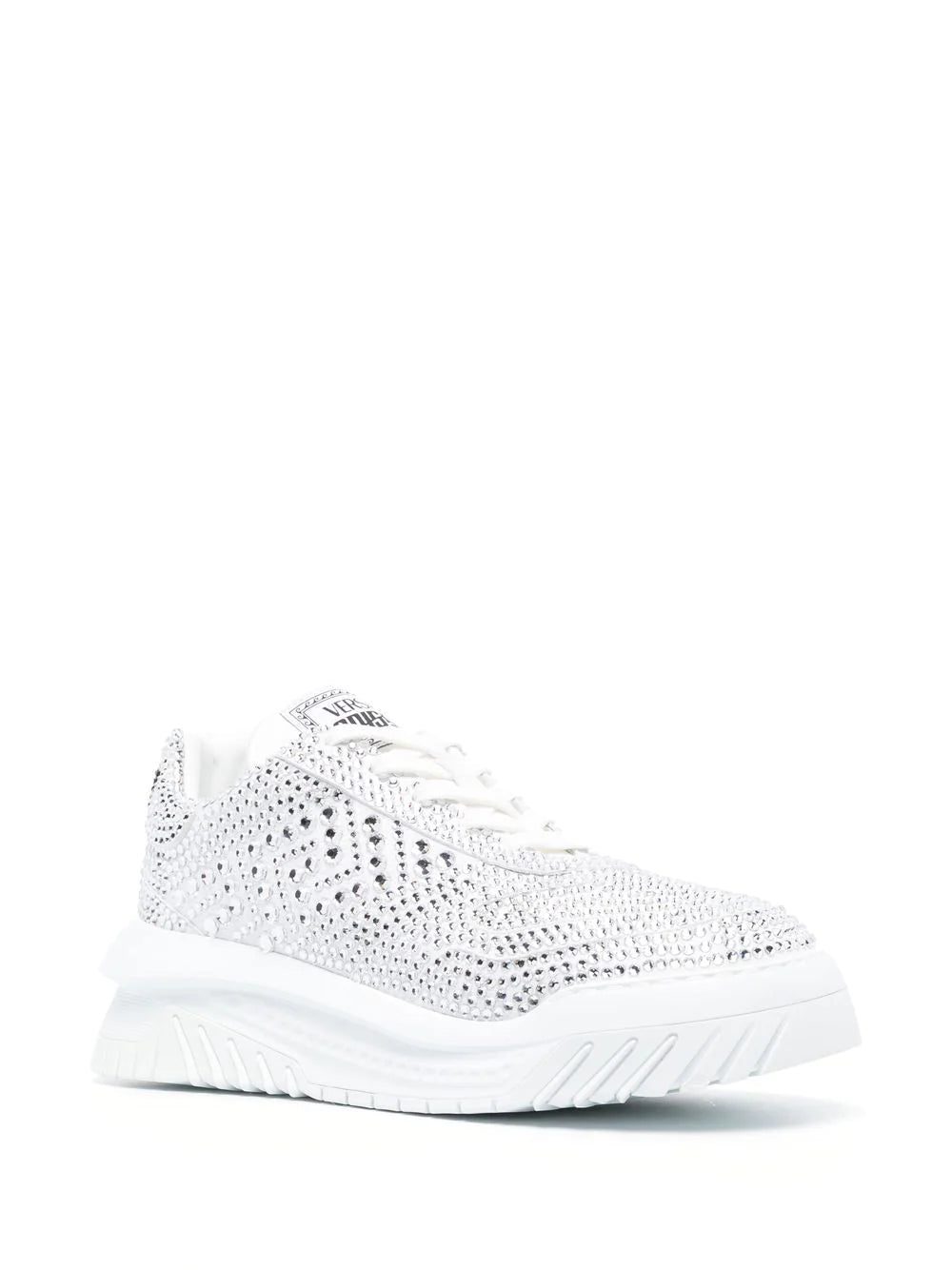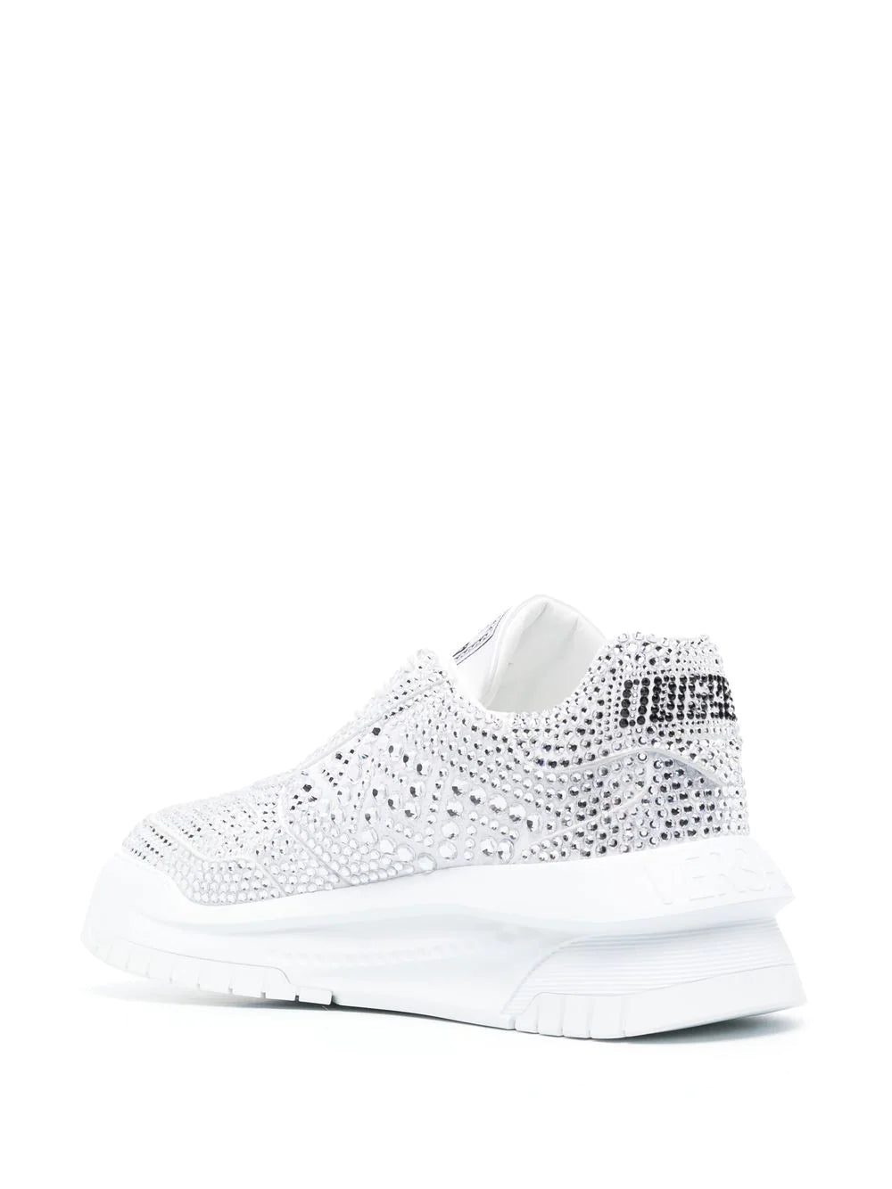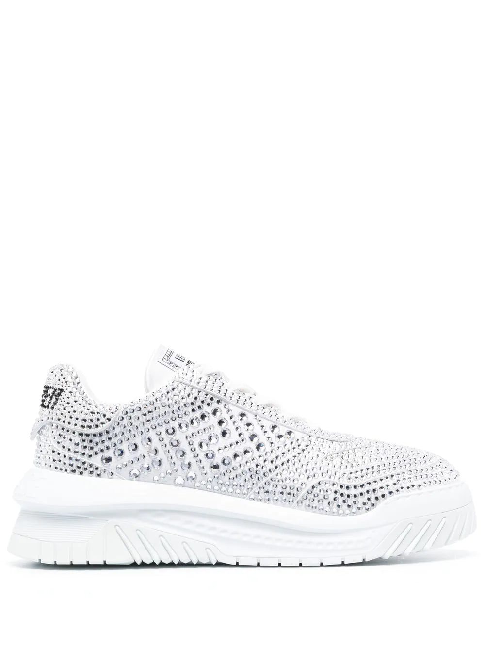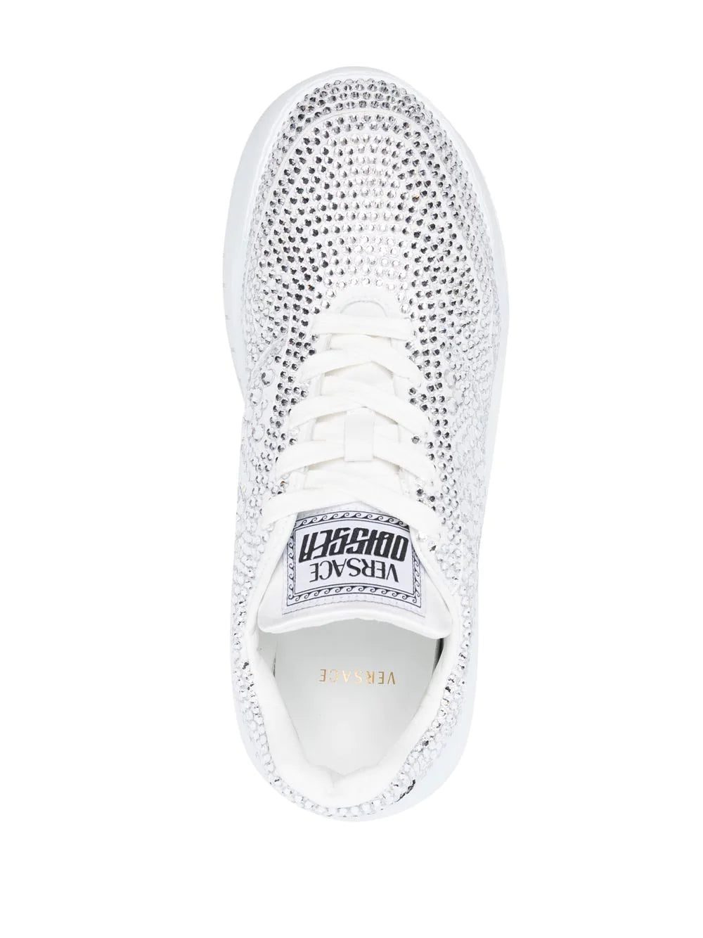 Versace showcases its maximalist style with these lace-up sneakers, embellished all-over with glimmering crystals. The logo patch adds a signature touch to the low-top pair.