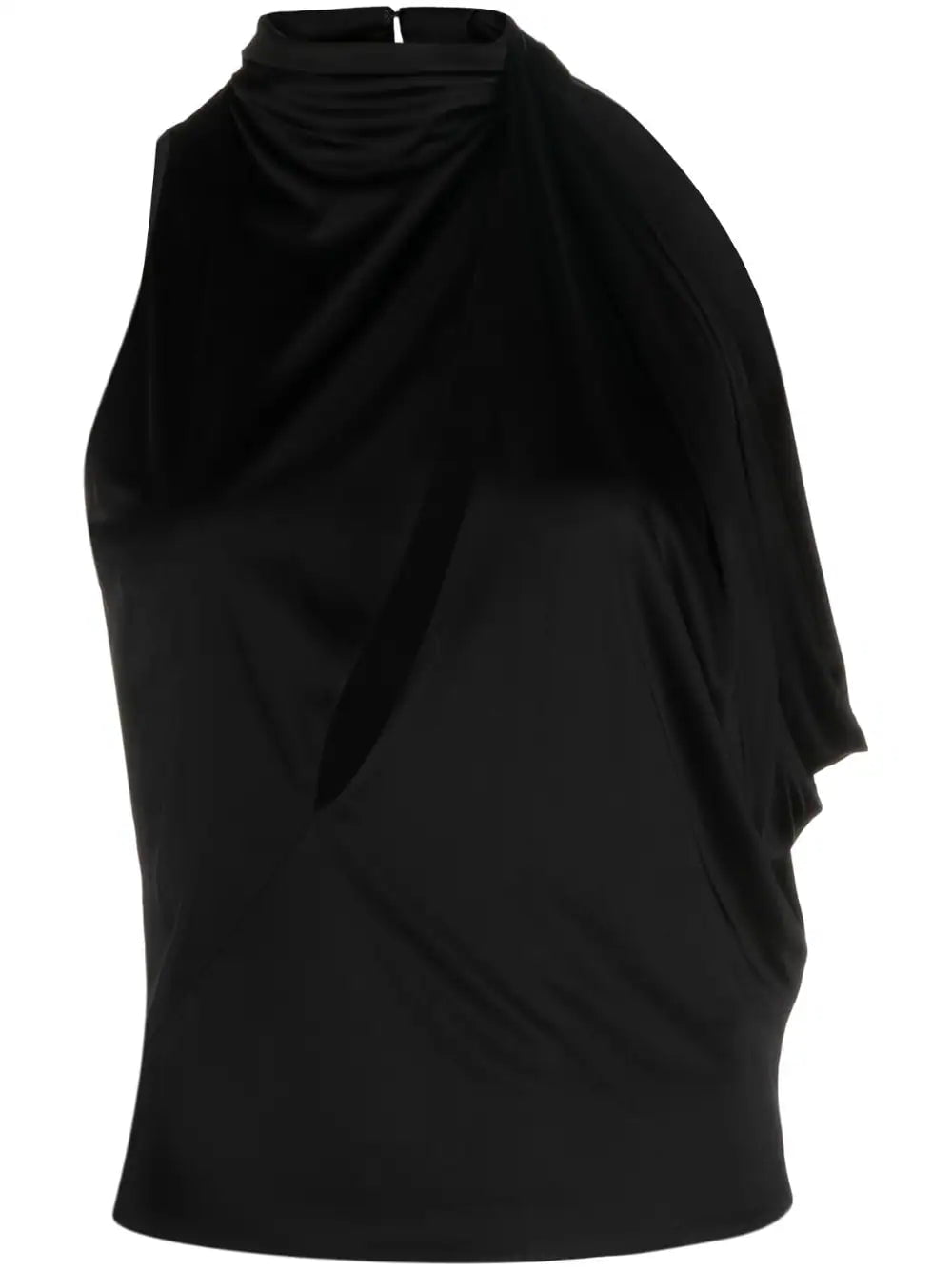 Versace illustrates its penchant for unexpected details with this top. The fluid, draped silhouette is enhanced with a diagonal slashed cut-out at the front.