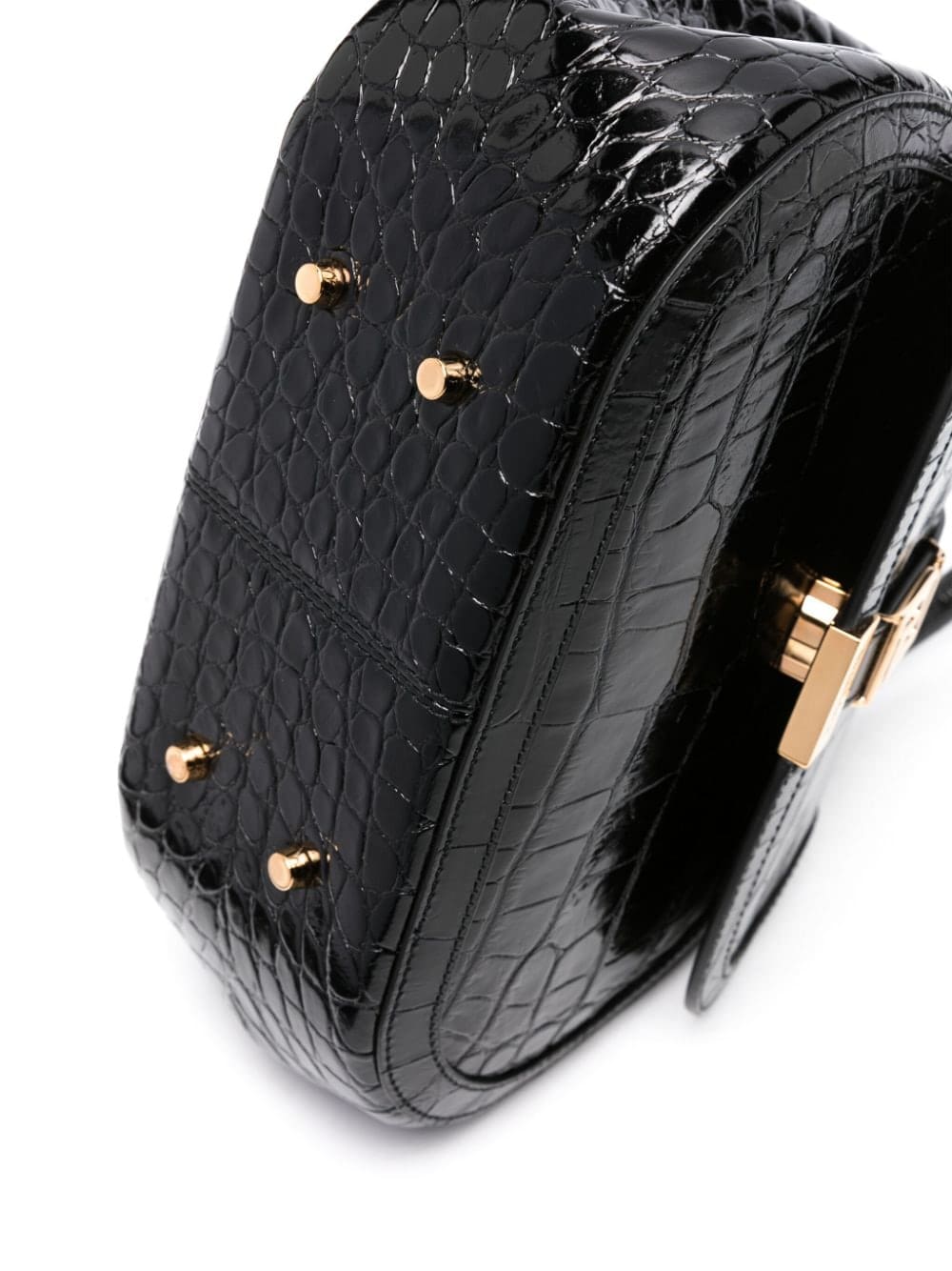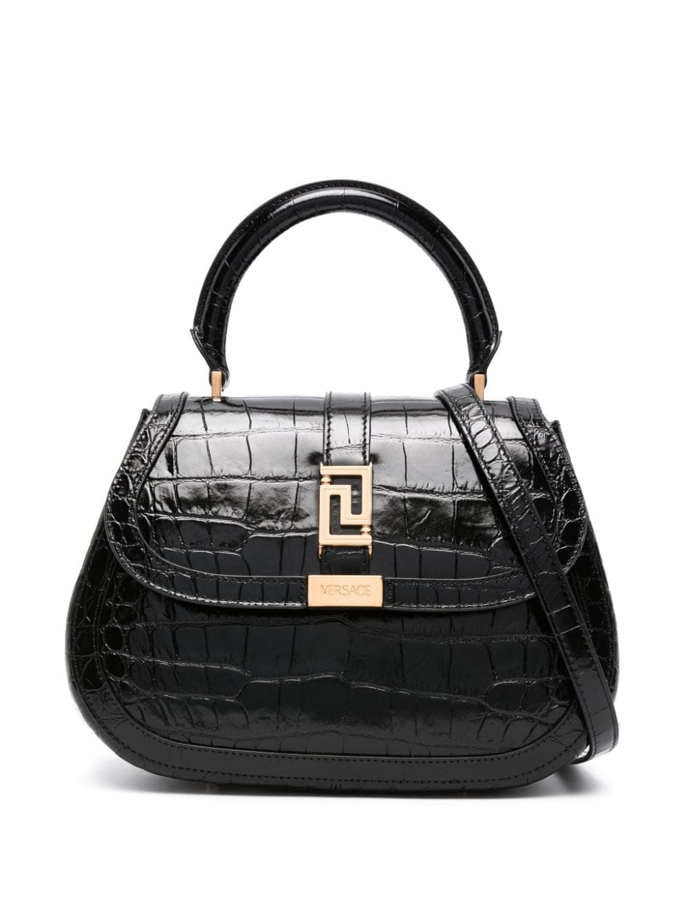 Embossed with a crocodile effect for a tactile finish, this black iteration of Versace's Greca Goddess is crafted from smooth calf leather in Italy. A gold-tone Greca plaque at the front speaks to the house's penchant for mythology-inspired motifs.