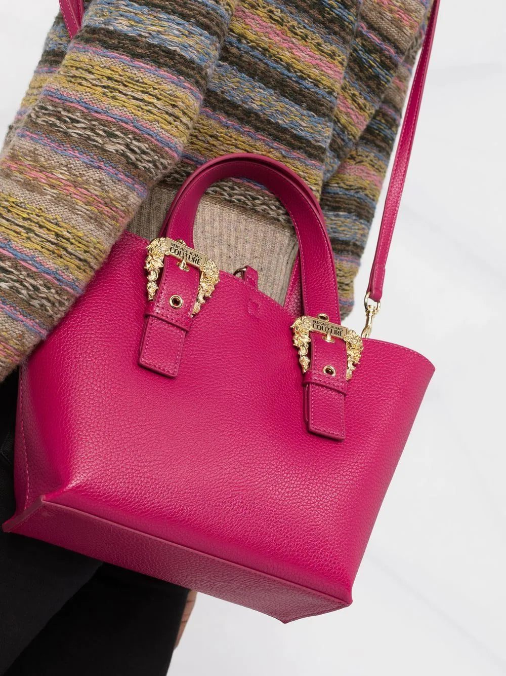Baroque-buckle tote bag from VERSACE JEANS COUTURE featuring dark pink, grained texture, gold-tone hardware, adjustable detachable shoulder strap, flat top handles, lobster claw fastening, main compartment and signature Baroque buckle.