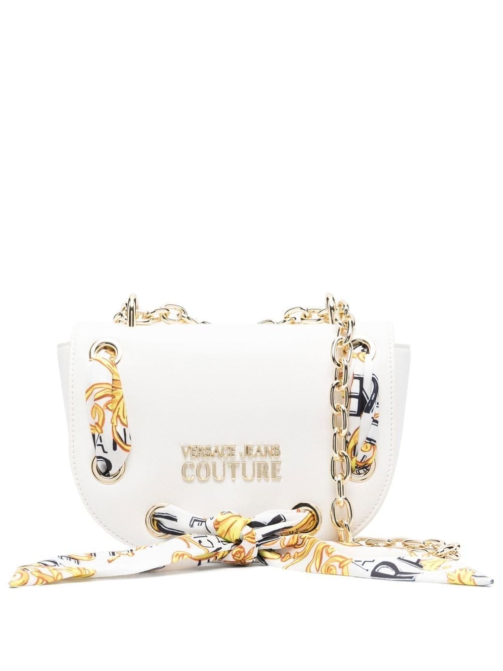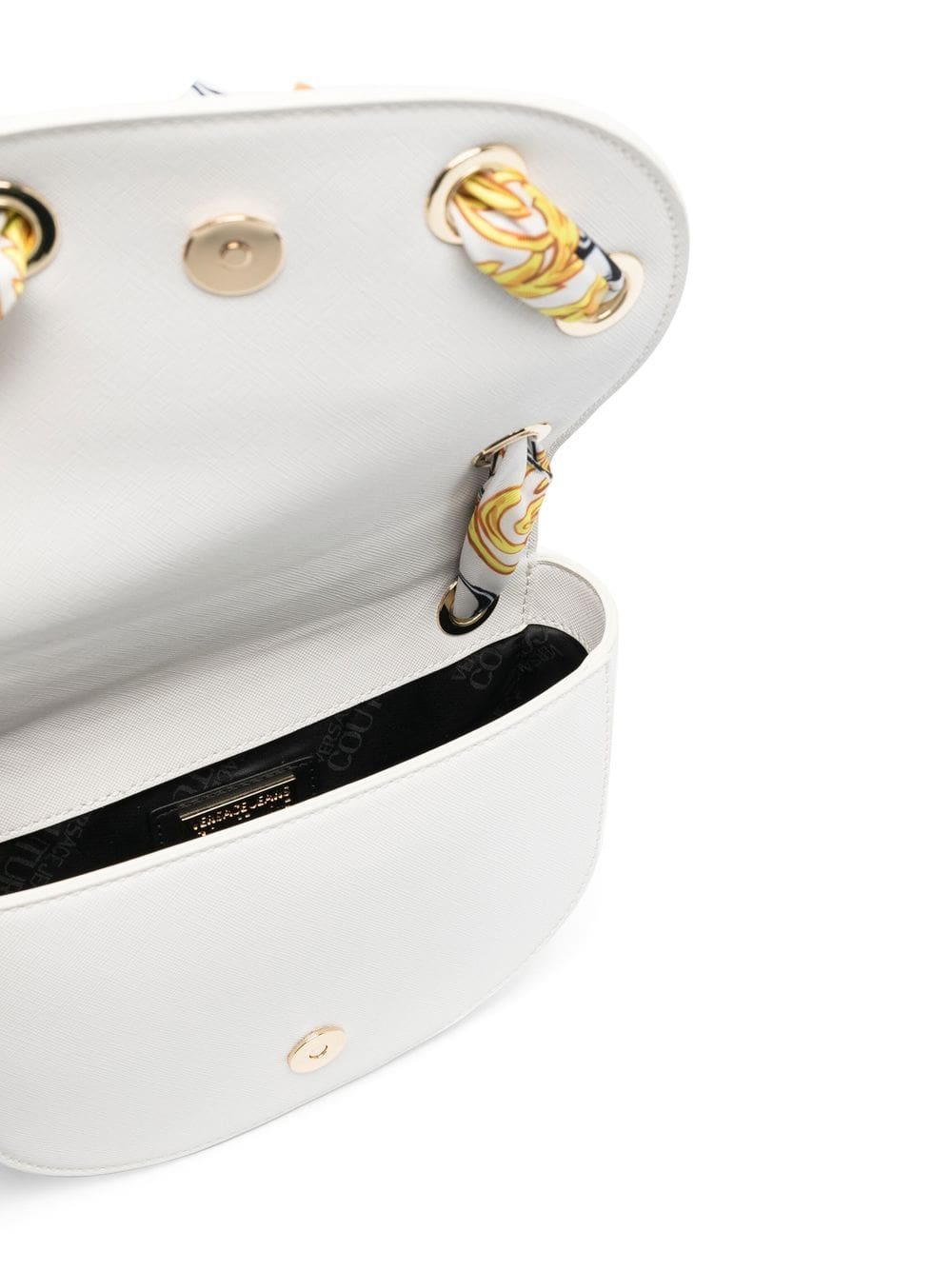 white faux leather grained texture gold-tone logo lettering internal logo plaque baroque-pattern print faux-leather and chain-link shoulder strap main compartment