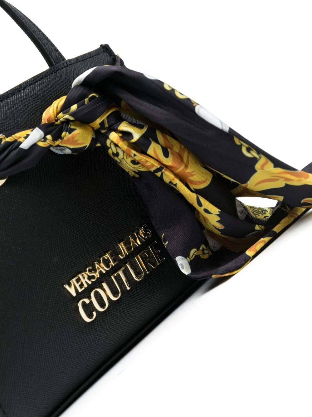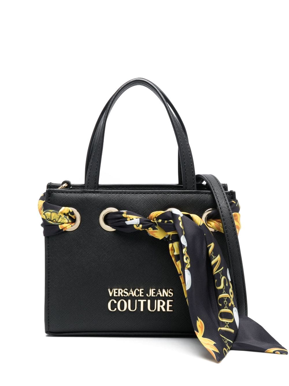 Presented in micro proportions, this bag by Versace Jeans Couture is crafted from black faux-leather with a durable cross-grain finish then threaded with a satin Chain Couture-print scarf through the top. It comes with a detachable shoulder strap and boasts a gold-tone logo at the front.
