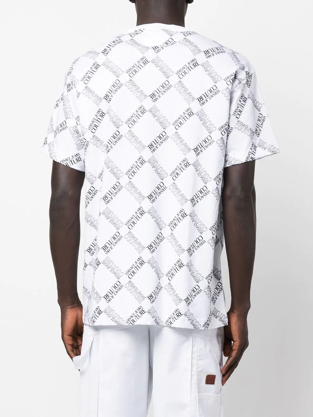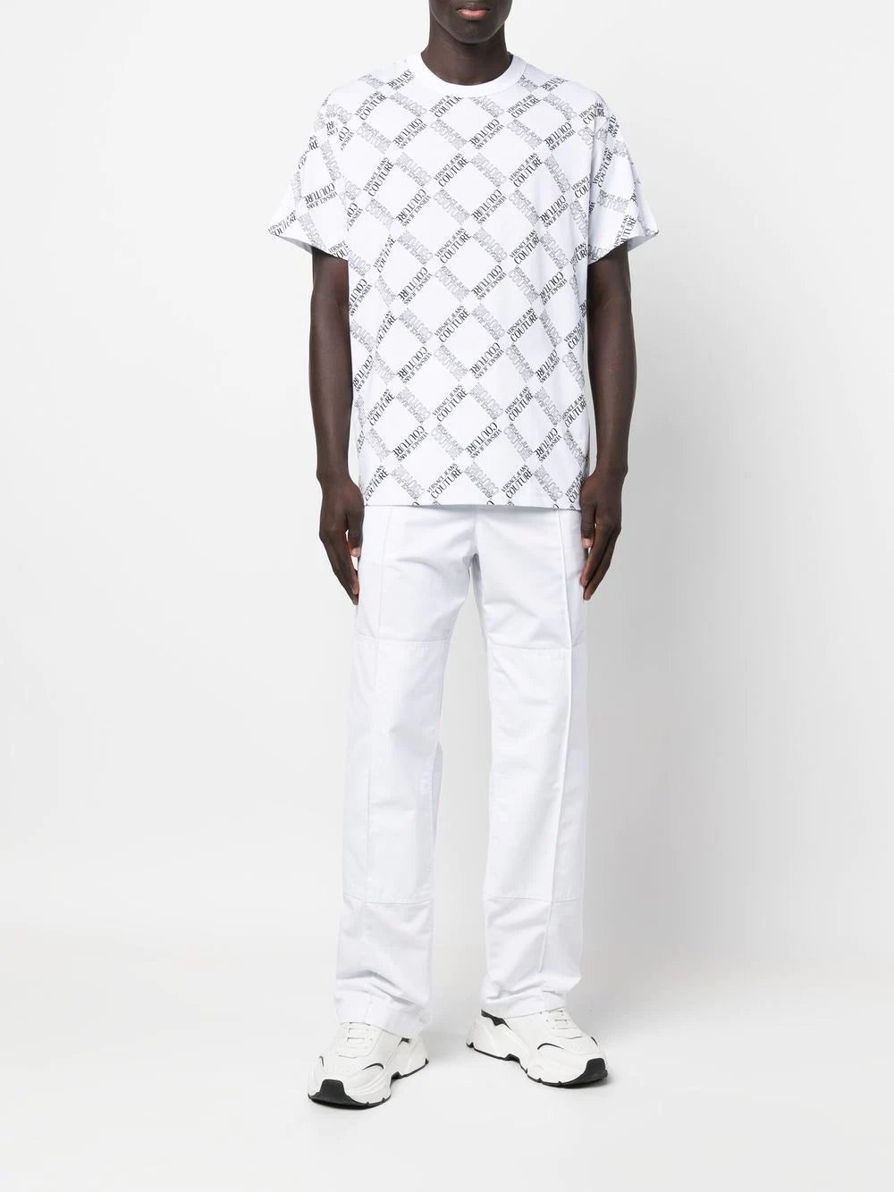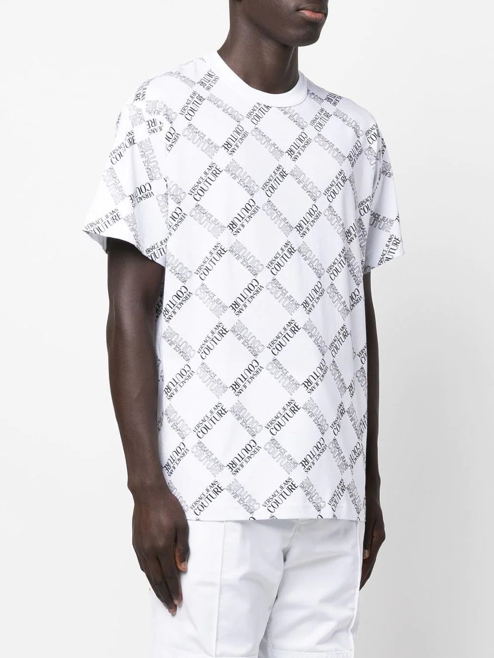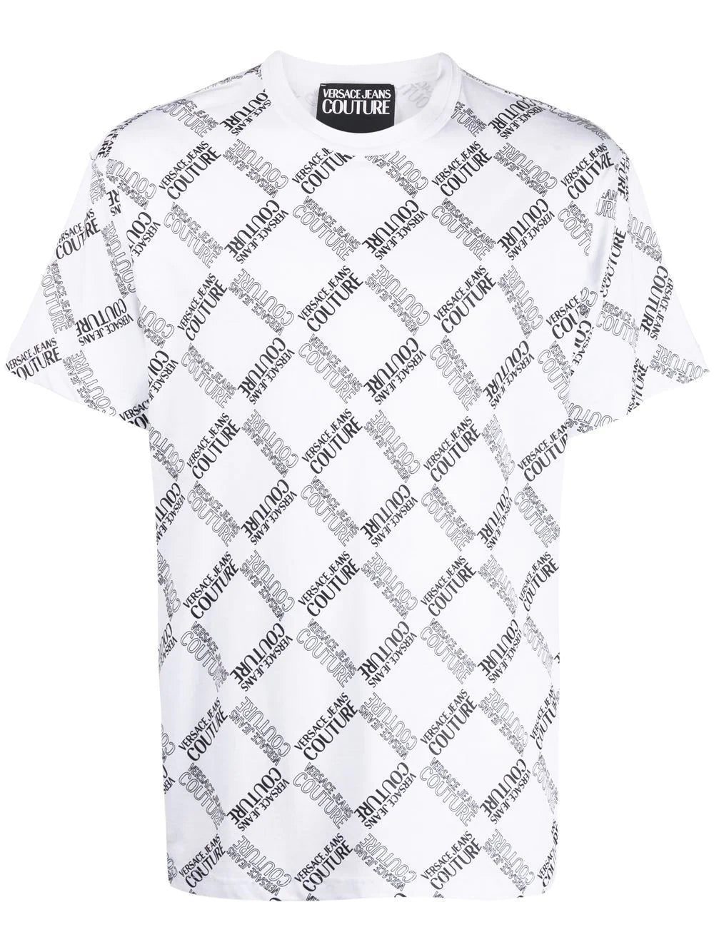 logo crew-neck T-shirt from VERSACE JEANS COUTURE featuring white, all-over logo print, crew neck and short sleeves.