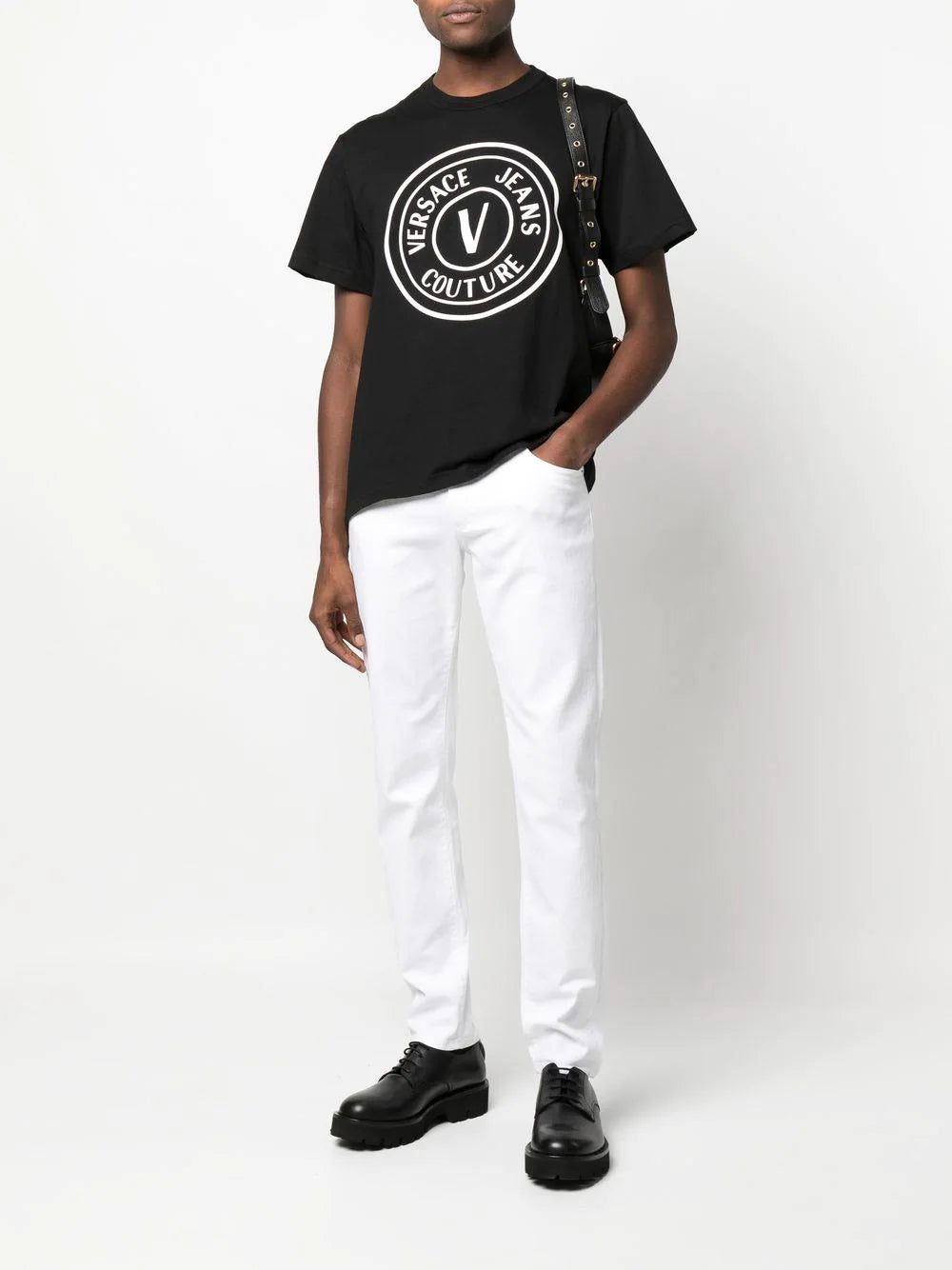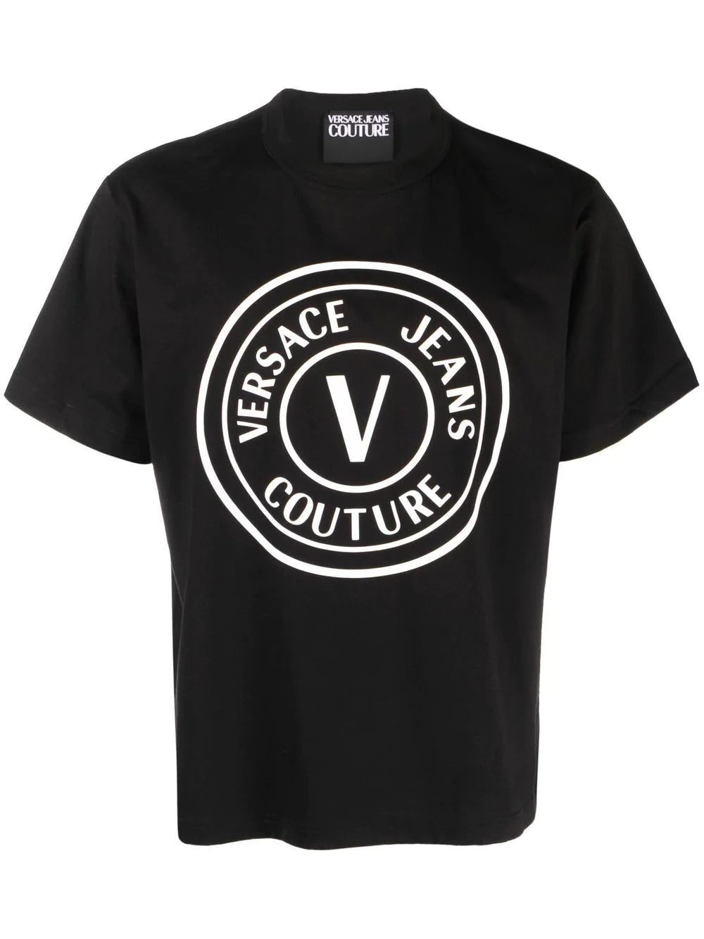 Versace Jeans Couture's fondness for bold branded designs is evident in this black T-shirt. With a classic silhouette, the style is elevated by a logo print on the front.