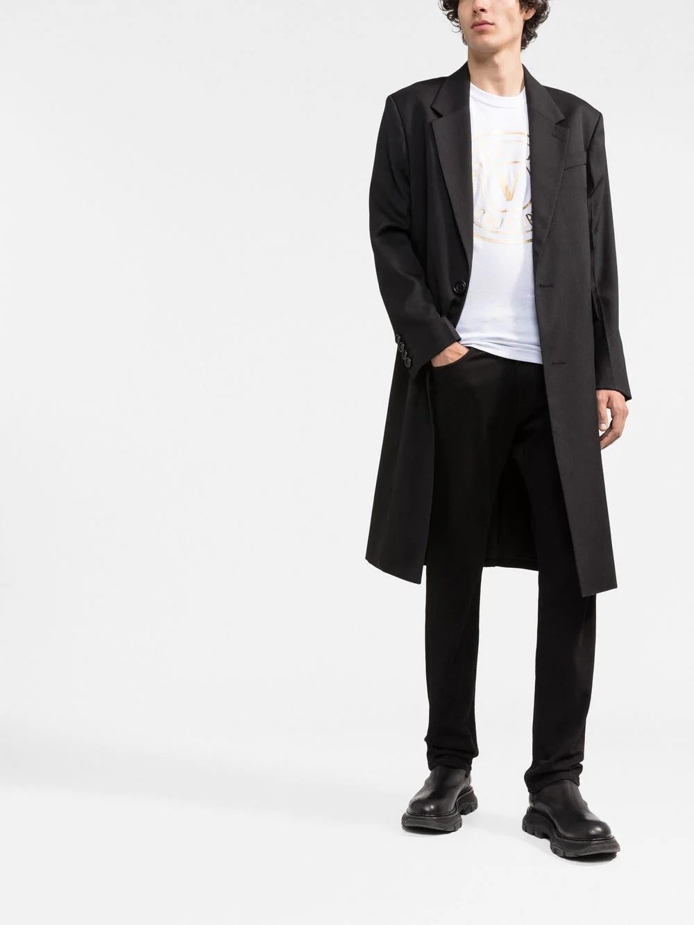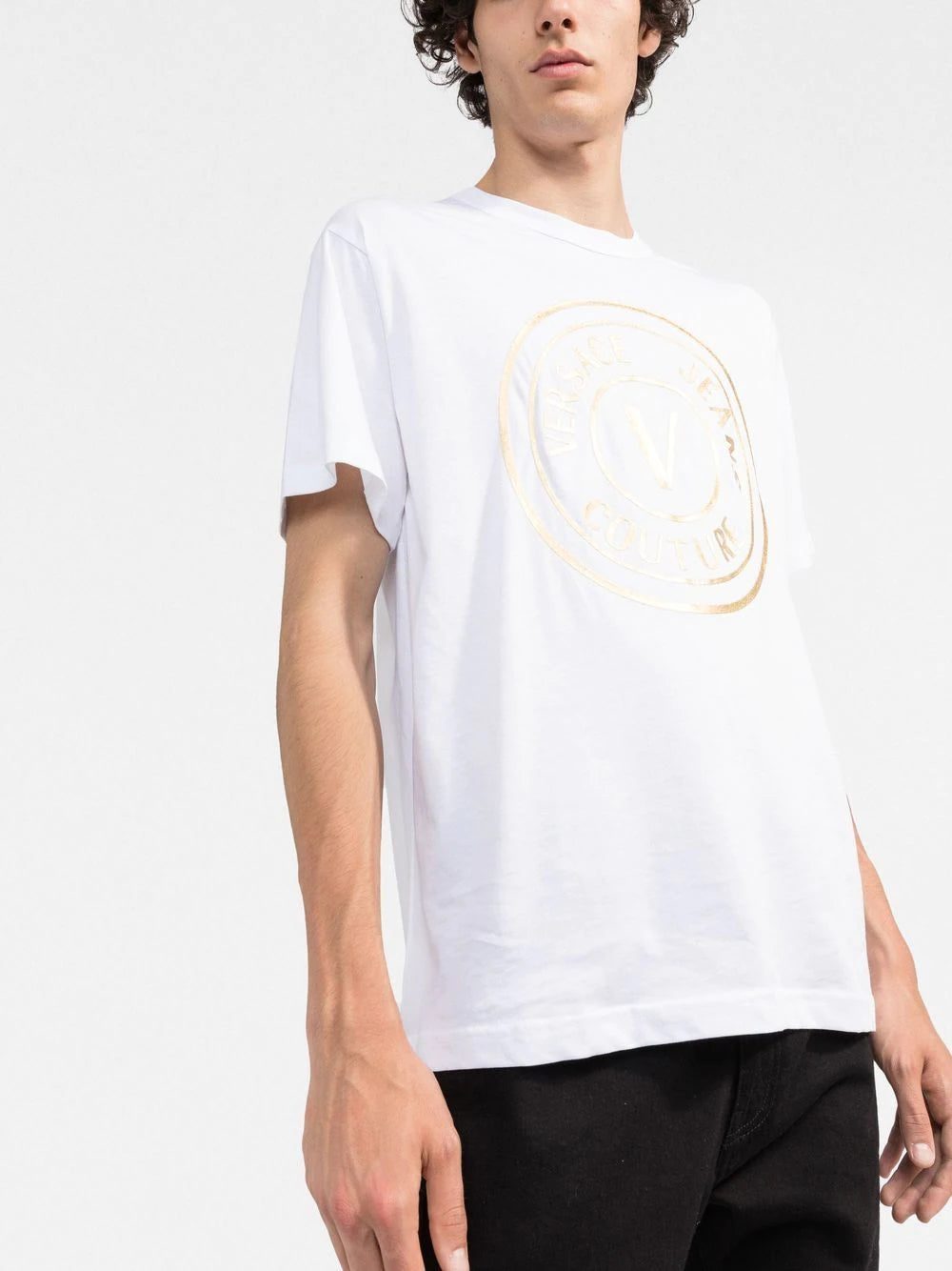Versace Jeans Couture brands this white T-shirt with its logo across the front in a gold-tone style that speaks to the brand's decadent style vision.