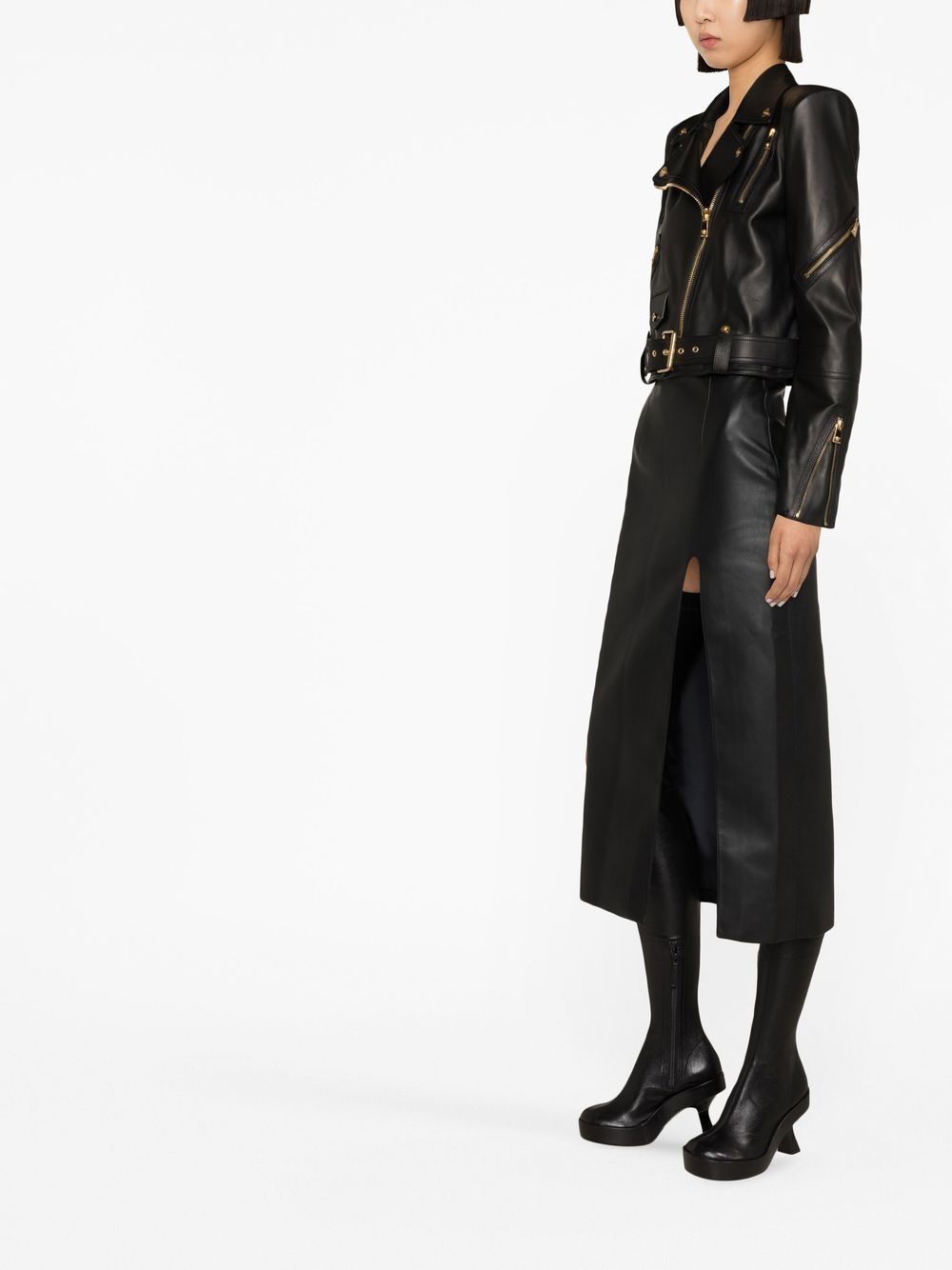 polished-finish long-sleeve dress from Versace featuring black, polished finish, notched collar, long sleeves, front zip fastening, zip details and belted waist.