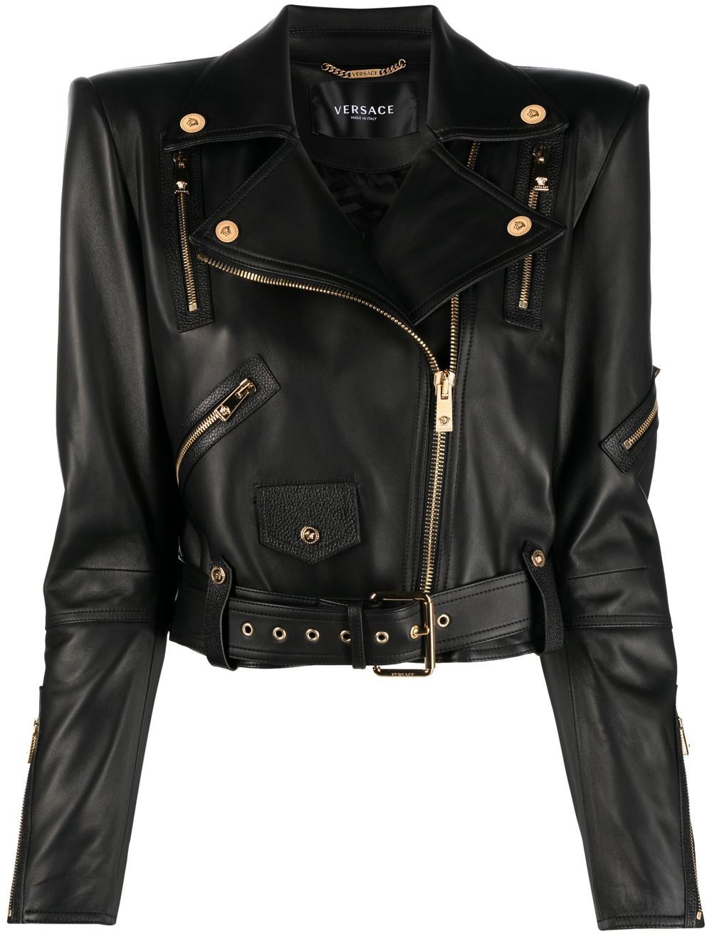 Versace takes an innovative and edgy approach to design on this polished-finish dress, by taking inspiration from classic details on a biker jacket. This is seen through zip fastenings and stud embellishments which have a simultaneous element of opulence thanks to their gold-tone hardware finish.