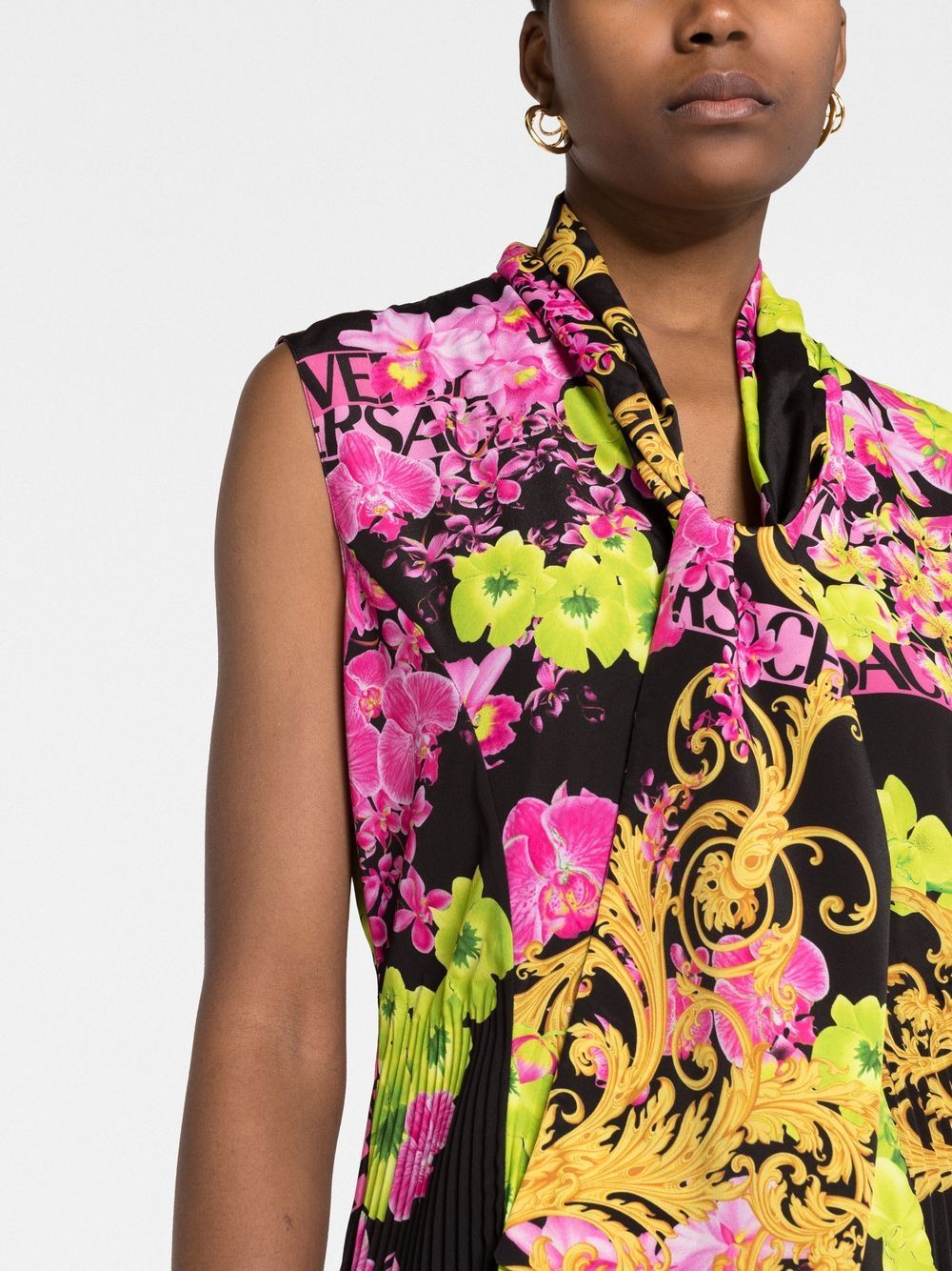 An eclectic sensibility defines this midi dress from Versace. It's decorated with the bold Logo Orchid print and cut with a shirt-style body and fully pleated skirt. The self-tie neckline and handkerchief hem nod to the brand's focus on silhouette-enhancing details.