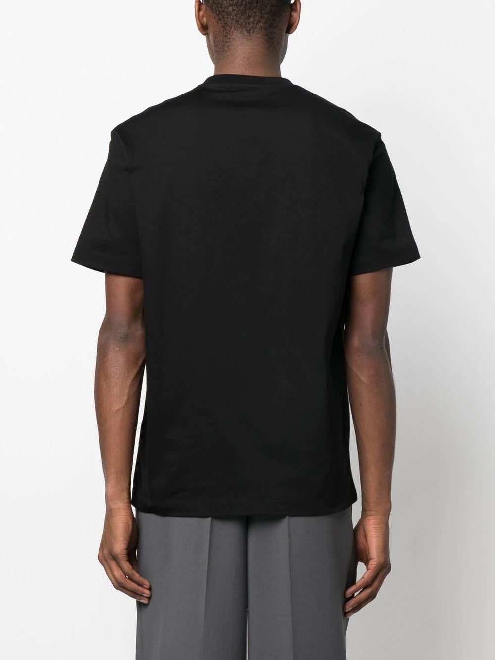 logo-print detail T-shirt from Versace featuring jet black, cotton, logo print to the front, round neck, short sleeves and straight hem.