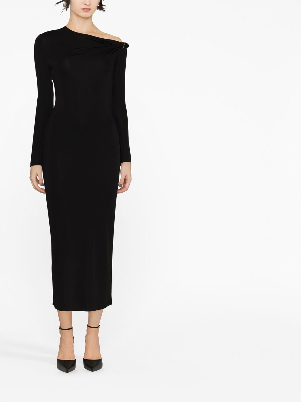 Versace reimagines the classic little black dress for SS23. This midi iteration is updated with an off-shoulder silhouette, held into place by a pin closure.