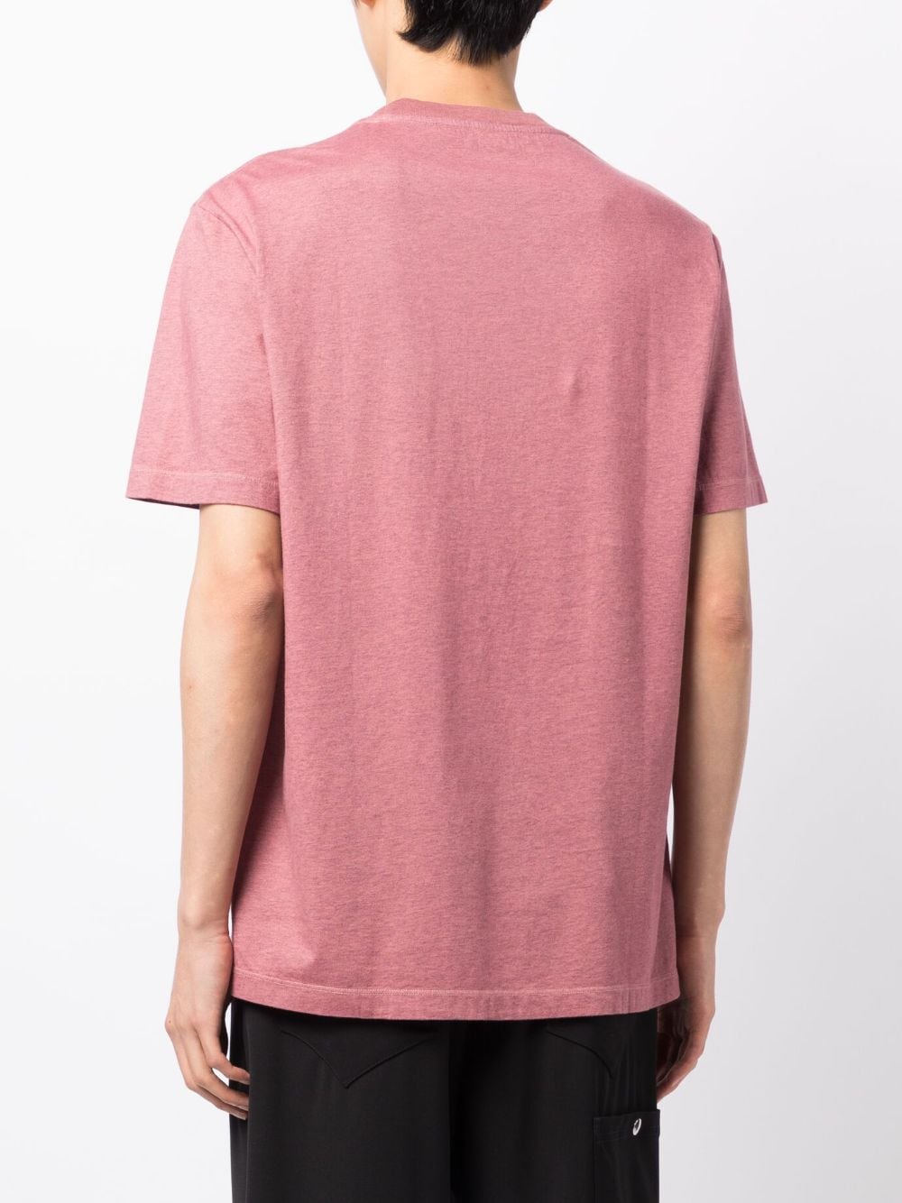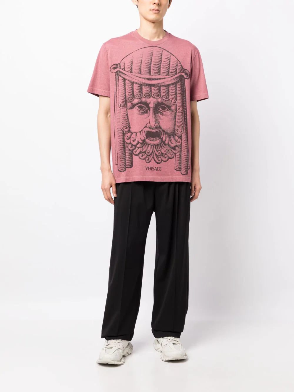 A graphic mask print takes over the front of this Versace shirt, lending the top an eye-catching look. The cotton jersey top boasts an overdyed treatment that lends it its rose pink hue.Â