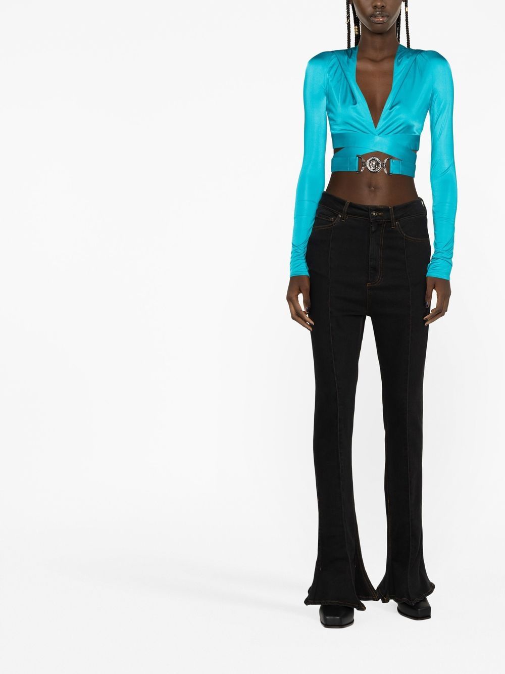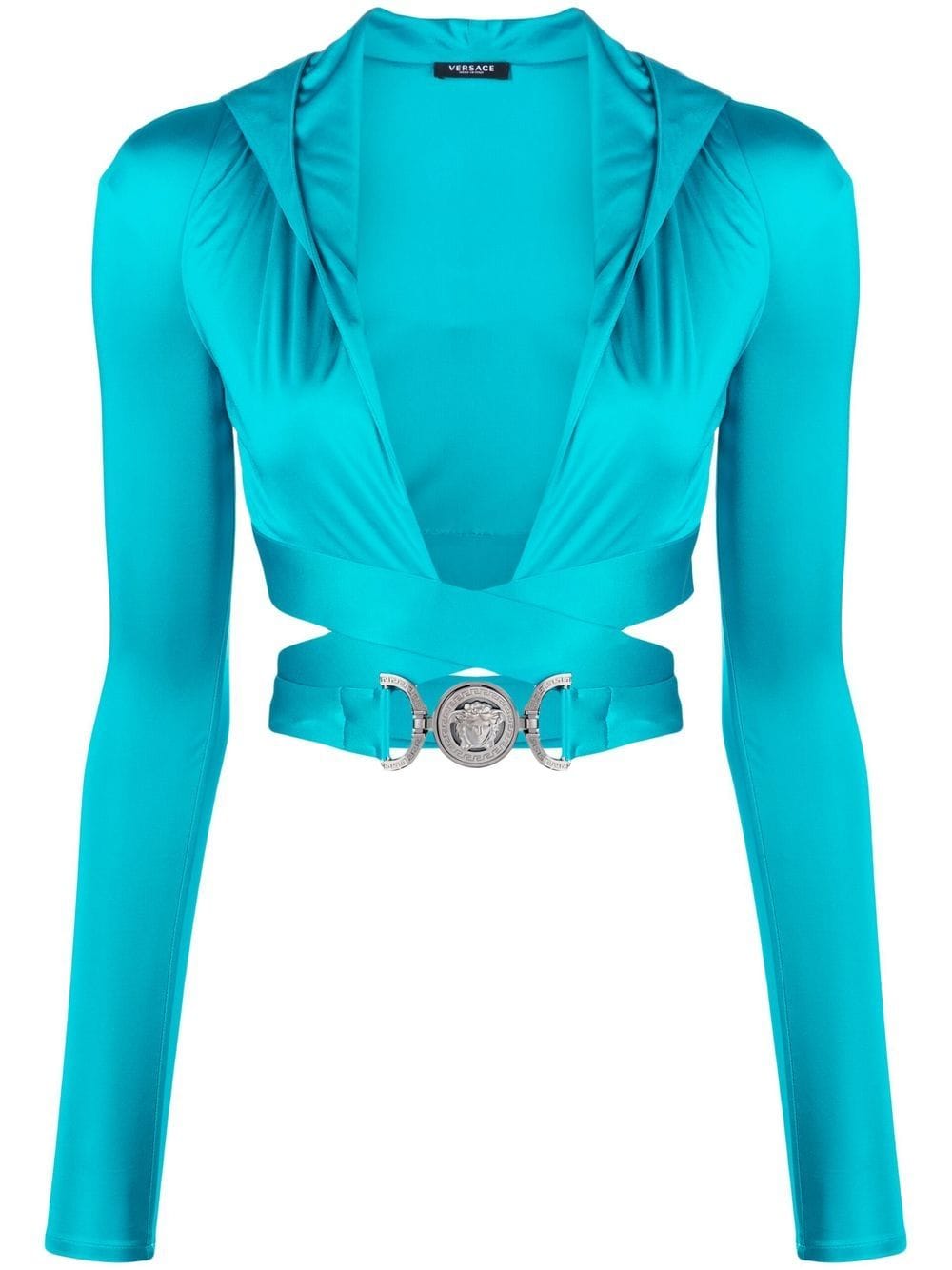 Versace’s extravagant style is hinted at with this hooded top. Presented in a lively turquoise blue colourway, this piece is defined by its cropped body that develops into a crisscross belt detail that culminates in a gold-tone Medusa head plaque for a distinct branded finish.