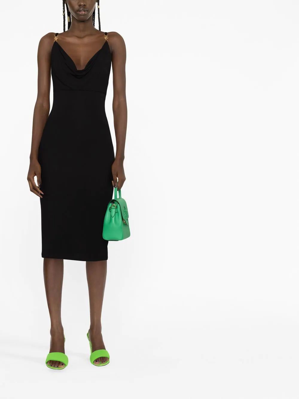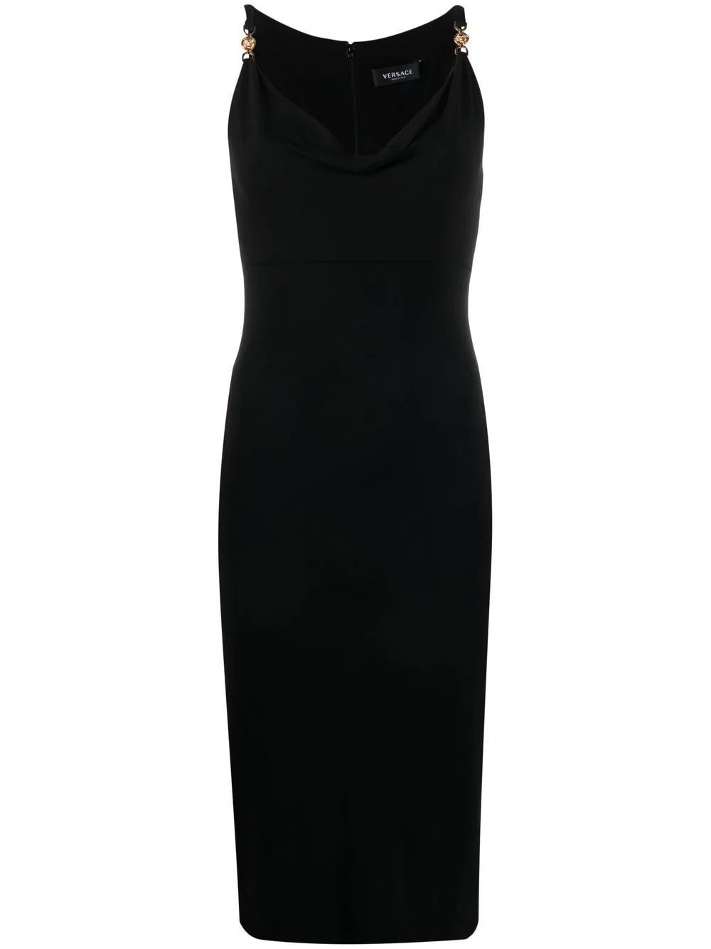 Designed with an elegant cowl neck, this midi dress from Versace is embellished with gold-toned Medusa plaque detailing at the straps.Â