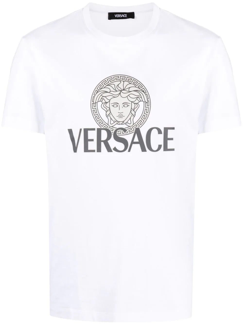 Versace’s iconic Medusa Head debuted in 1993 and dates back to the founder’s childhood – the emblem was originally inspired by a discovery found among local Roman ruins where Gianni and Donatella Versace used to play. A printed version is layered beneath a logo at the front of this white cotton T-shirt.
