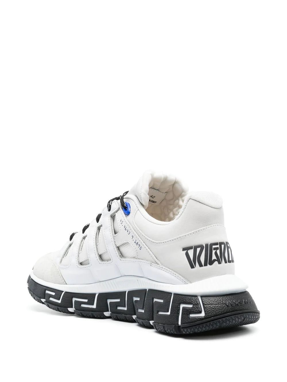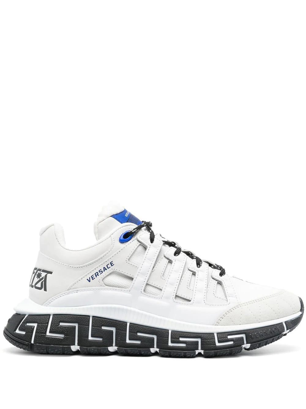Trigreca low-top sneakers from Versace featuring white/black, blue, calf leather, signature Greca-pattern print, panelled design, logo patch at the tongue, round toe, front lace-up fastening, branded insole and chunky rubber sole.