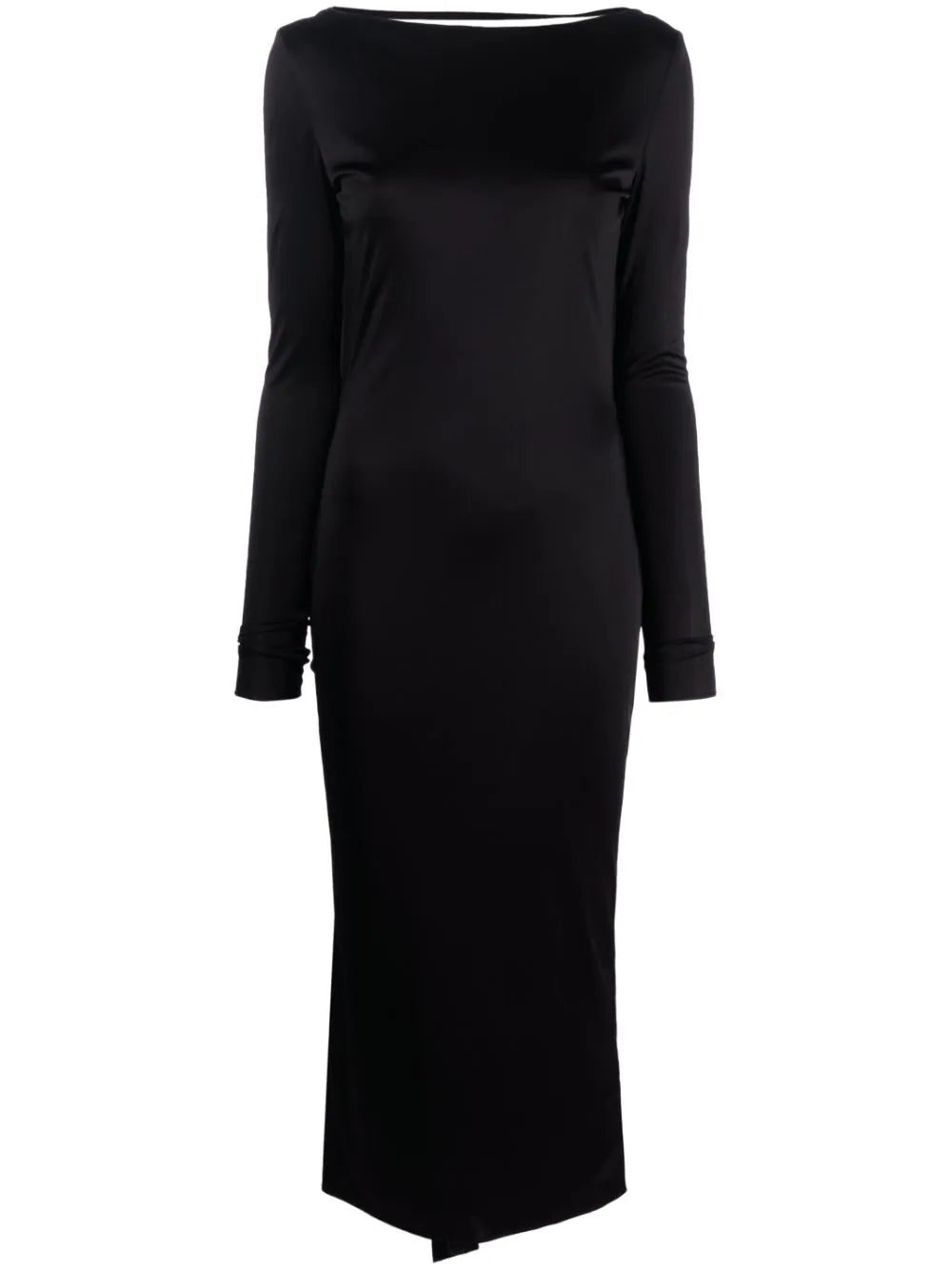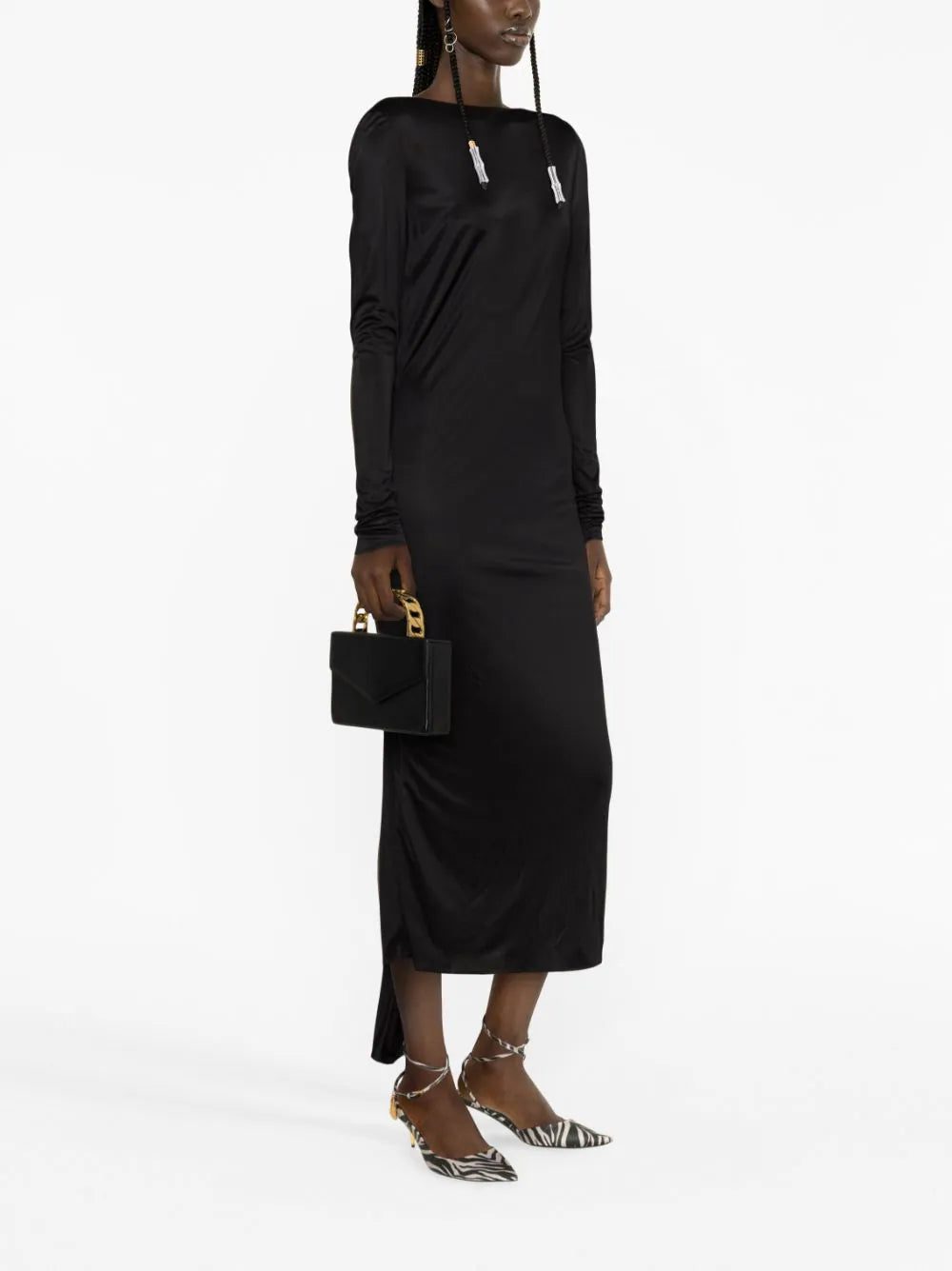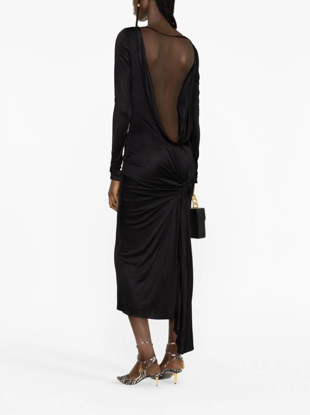 Designed in collaboration Dua Lipa, this dress is the perfect fusion of the singerās personal style and Versaceās seductive nature. Itās crafted in black jersey to a slinky silhouette that seems demure at from the front, but turns to reveal a draped, back-baring open reverse with a gathered knot that cascades below the midi hemline.