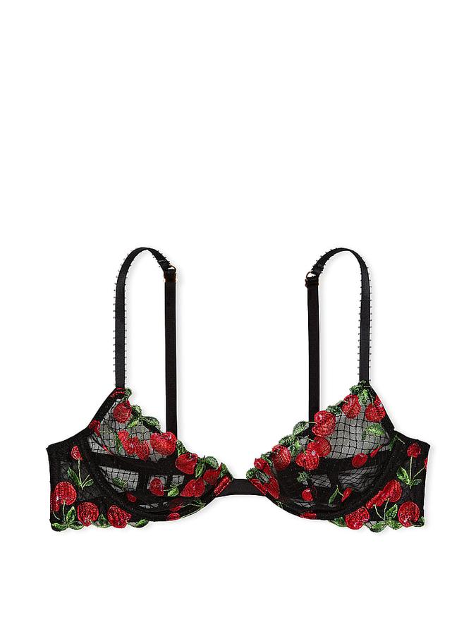 With cherries on top, this demi gets a sweet-tart twist that begs to be seen. Luxe embroidery embellishes this low-cut style, complete with cage-back styling.
